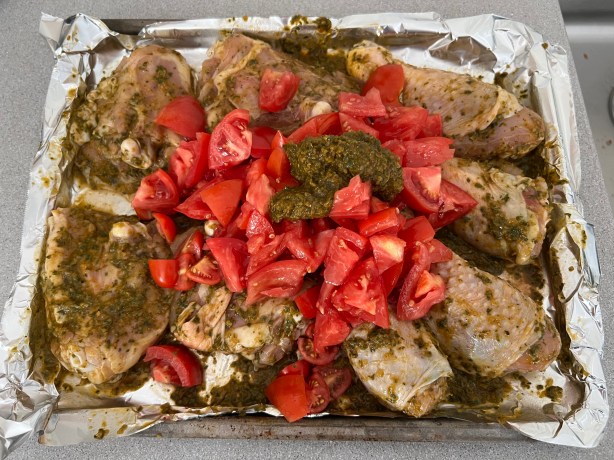 Grab a bunch of tomatoes, cut them up, removing some of the seeds (but not really worrying about it either way) and mix a little chimi in the tomatoes. Place the tomatoes on the bottom of the roasting pan, and place the chicken pieces on top, so the chicken skin will crisp up while it cooks.