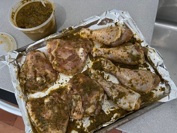 Place the thawed chicken pieces in a baking pan, and rub them really well with a generous amount of the chimi. Get it under the skin where you can, not just the outside. (Just remember that you’re handling raw chicken, so the moment you touch the chimi with raw chicken hands, you’ve contaminated the batch! Use a separate bowl with part of the chimi, so you don’t ruin the rest.)