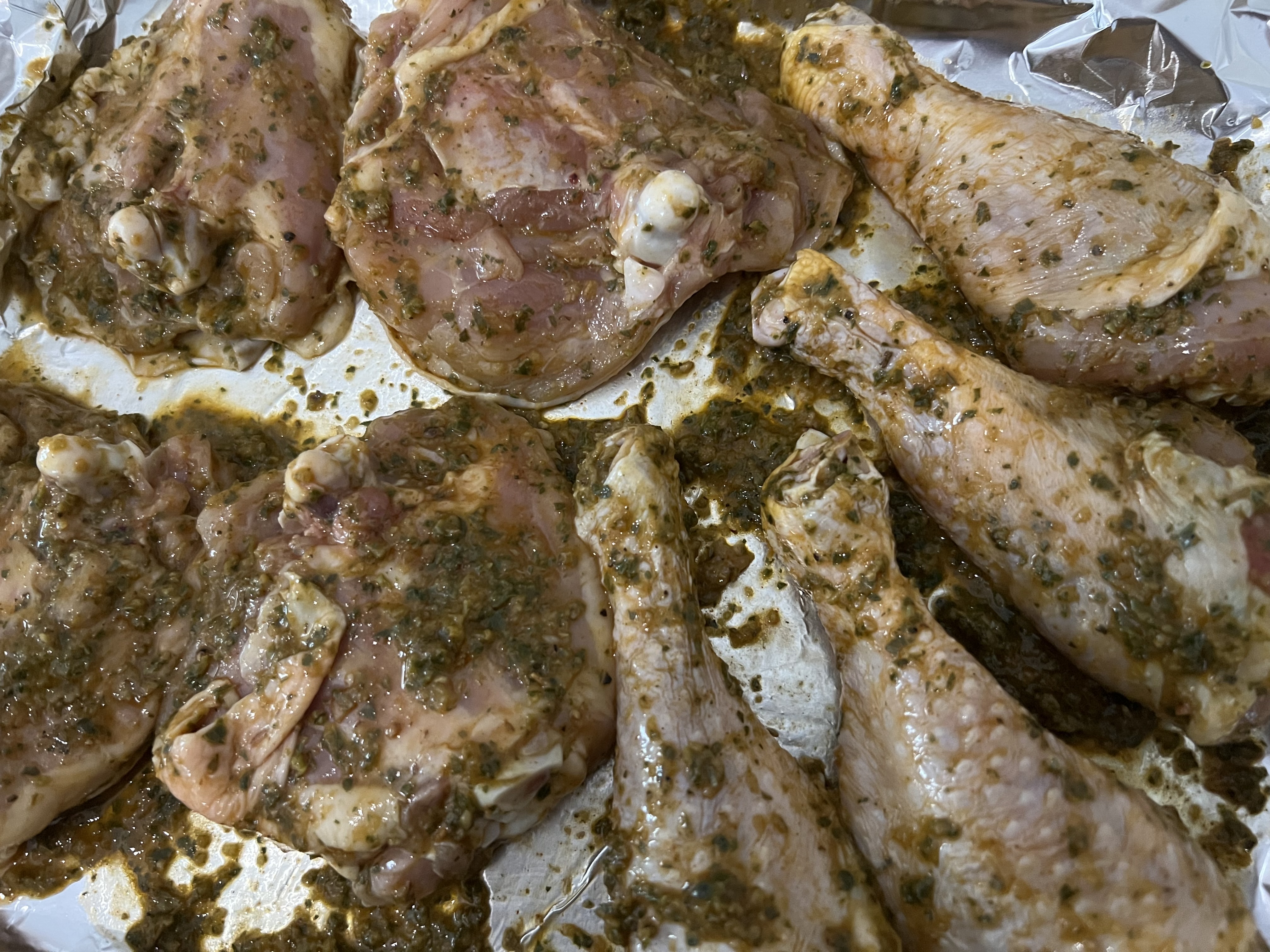 Place the thawed chicken pieces in a baking pan, and rub them really well with a generous amount of the chimi. Get it under the skin where you can, not just the outside. (Just remember that you’re handling raw chicken, so the moment you touch the chimi with raw chicken hands, you’ve contaminated the batch! Use a separate bowl with part of the chimi, so you don’t ruin the rest.)