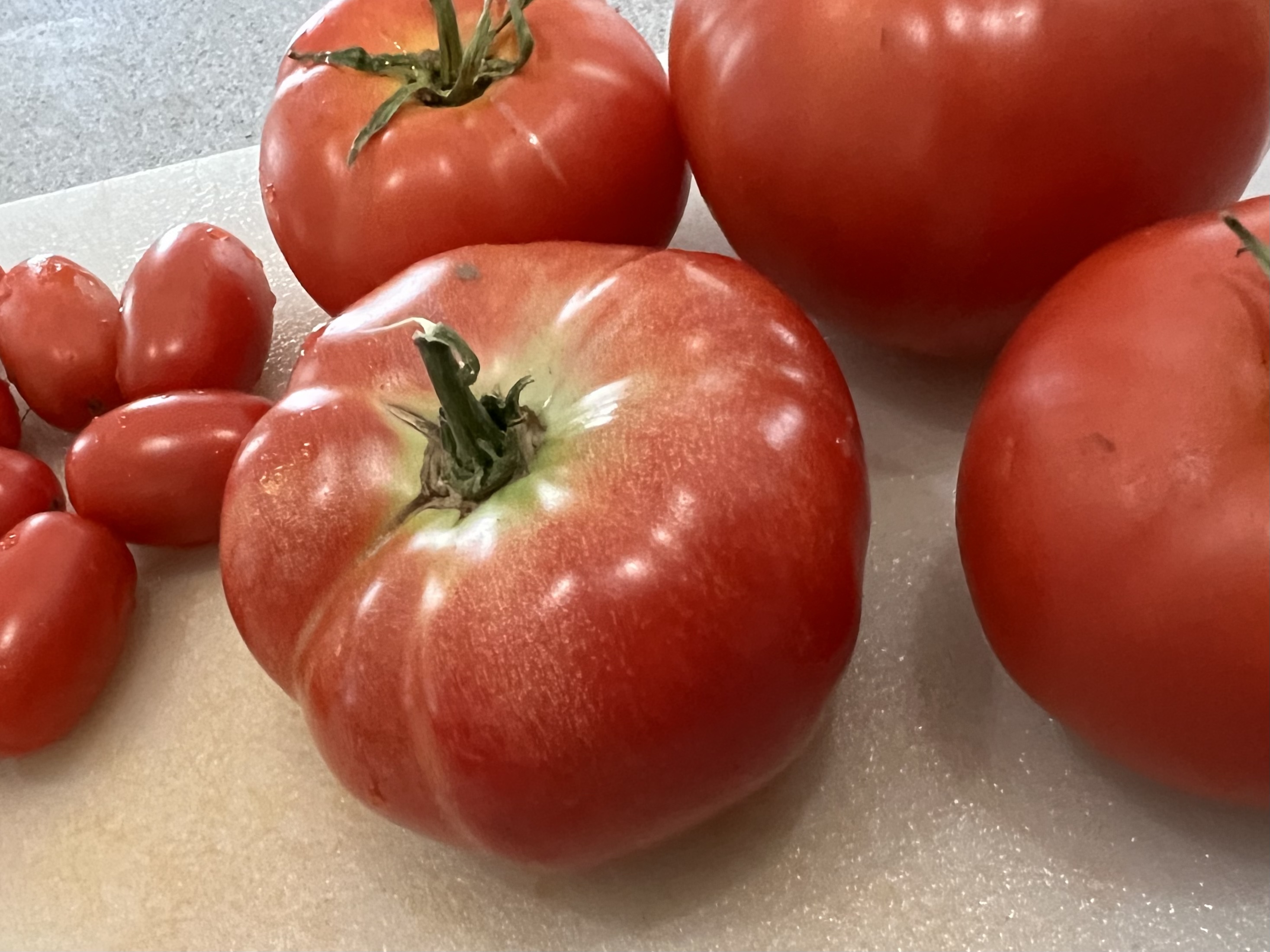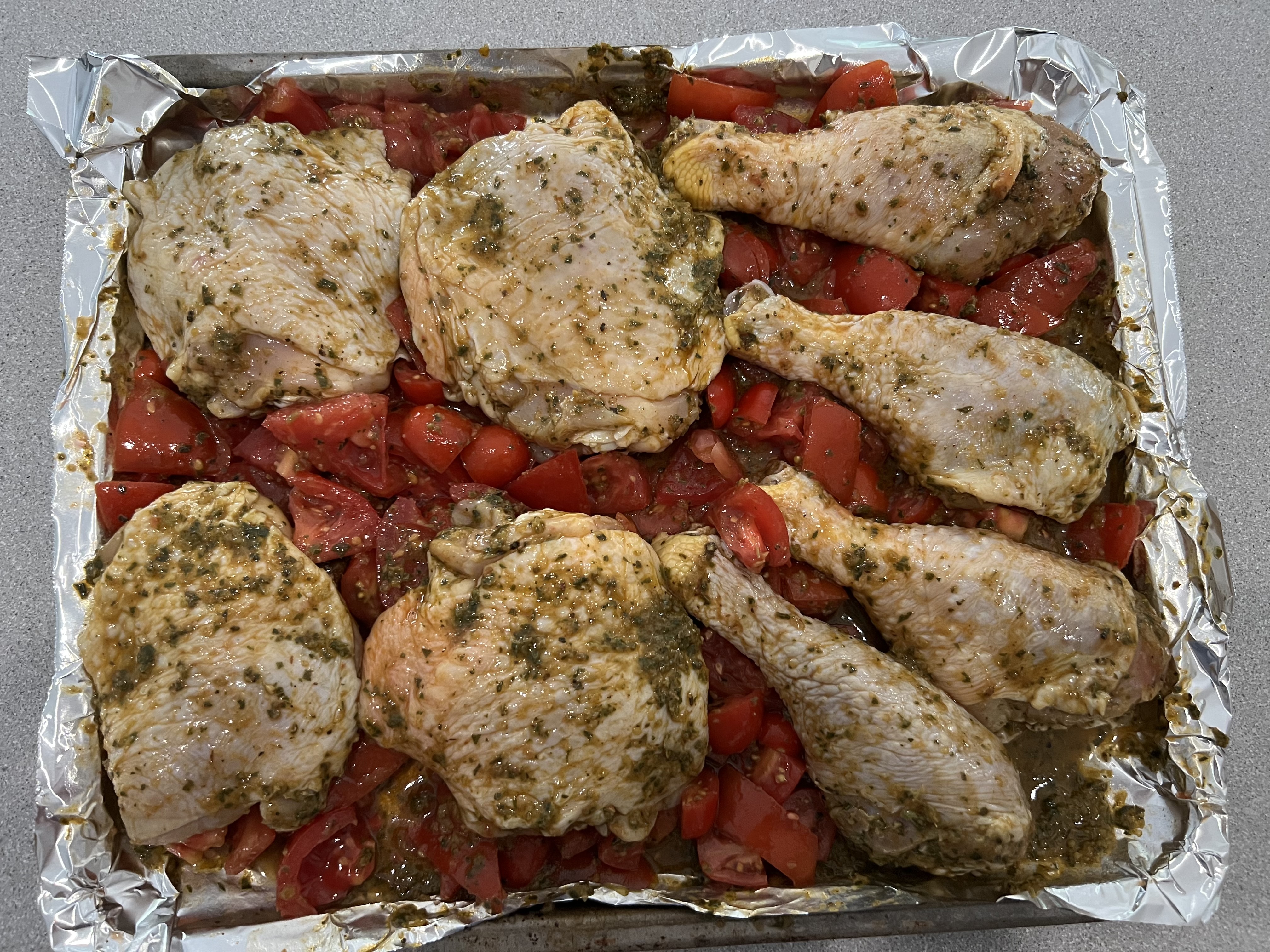 Grab a bunch of tomatoes, cut them up, removing some of the seeds (but not really worrying about it either way) and mix a little chimi in the tomatoes. Place the tomatoes on the bottom of the roasting pan, and place the chicken pieces on top, so the chicken skin will crisp up while it cooks.