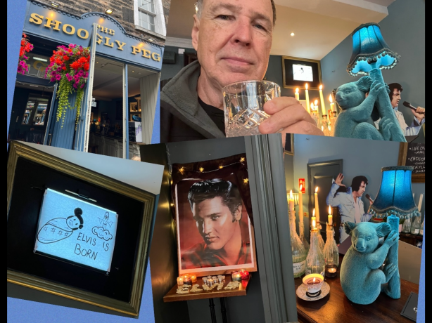 Elvis died in the month of August, and this local pub in Edinburgh, Scotland, The Shoogly Peg, had a shrine dedicated to him! I had to have a beverage as a tribute.