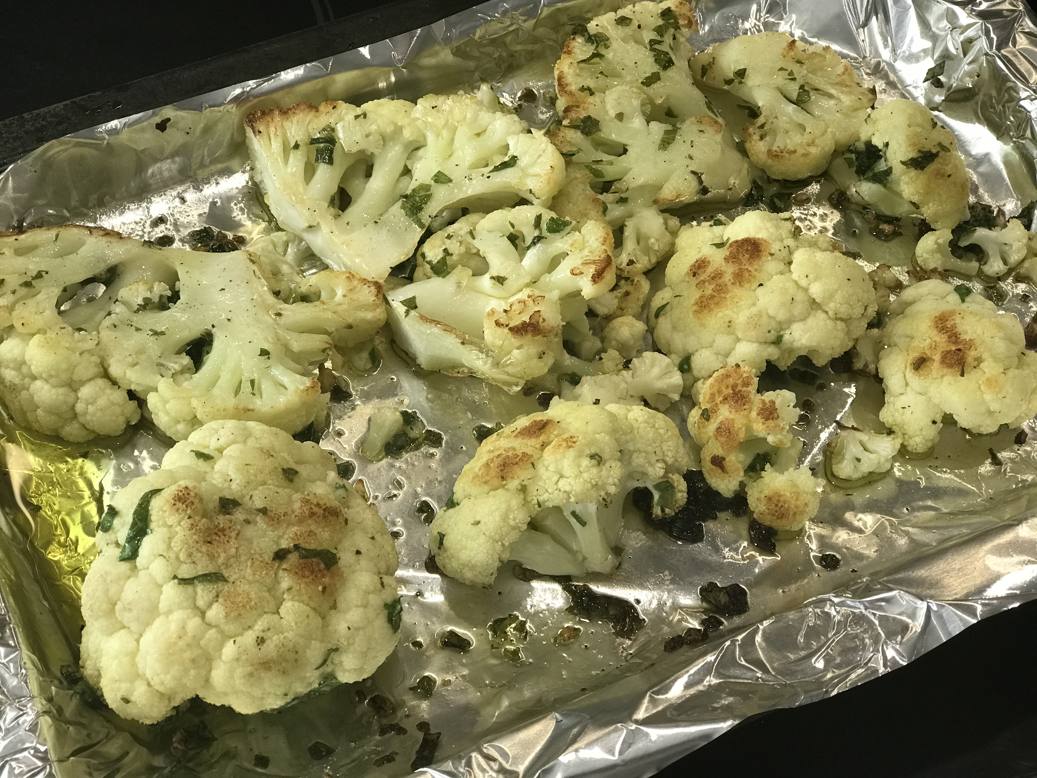 Place the baking pan in a pre-heated 400-degree oven and bake it for about an hour, until the cauliflower is golden brown on the edges. Flip the cauliflower steaks over after the first 30 minutes.