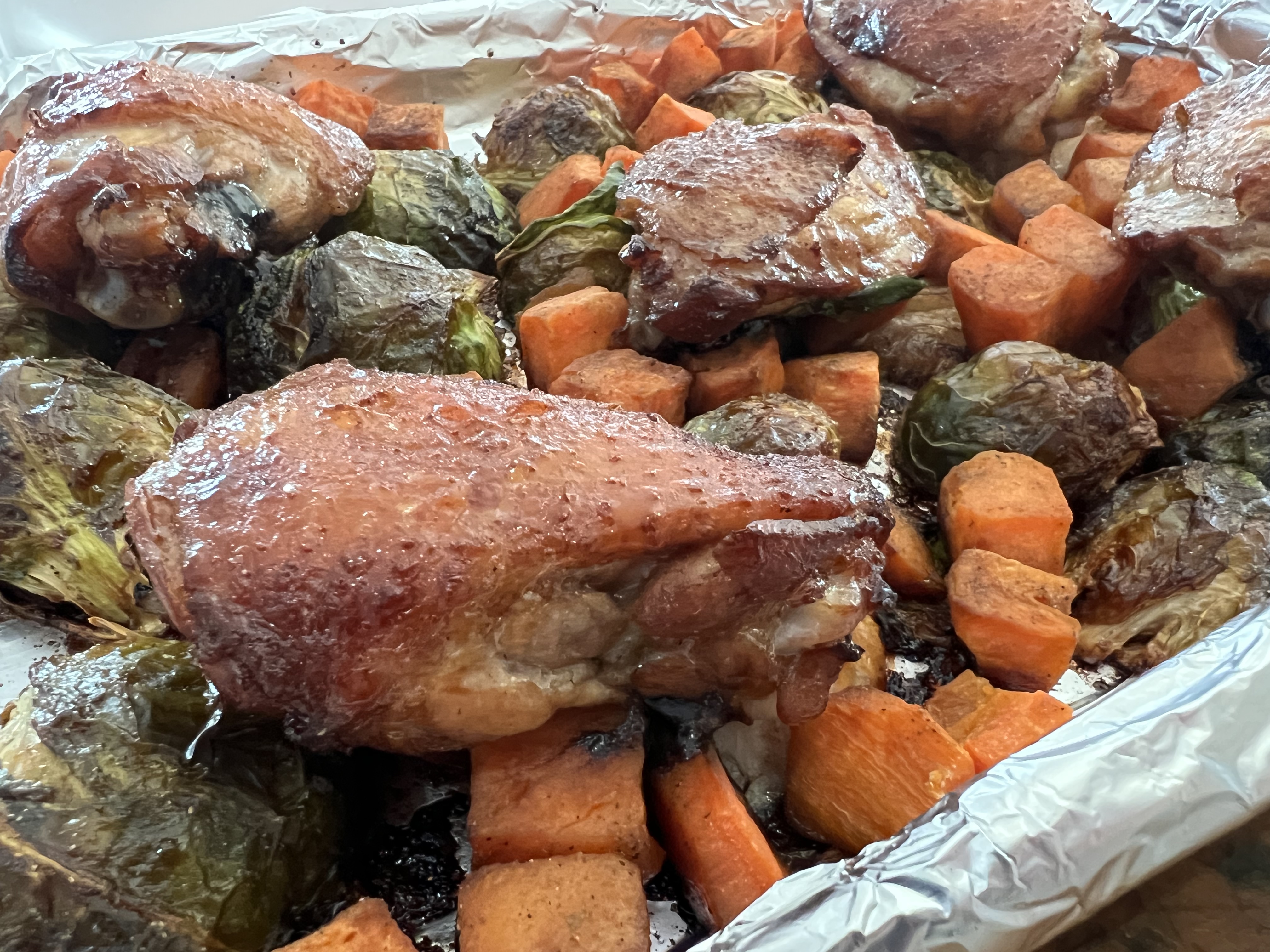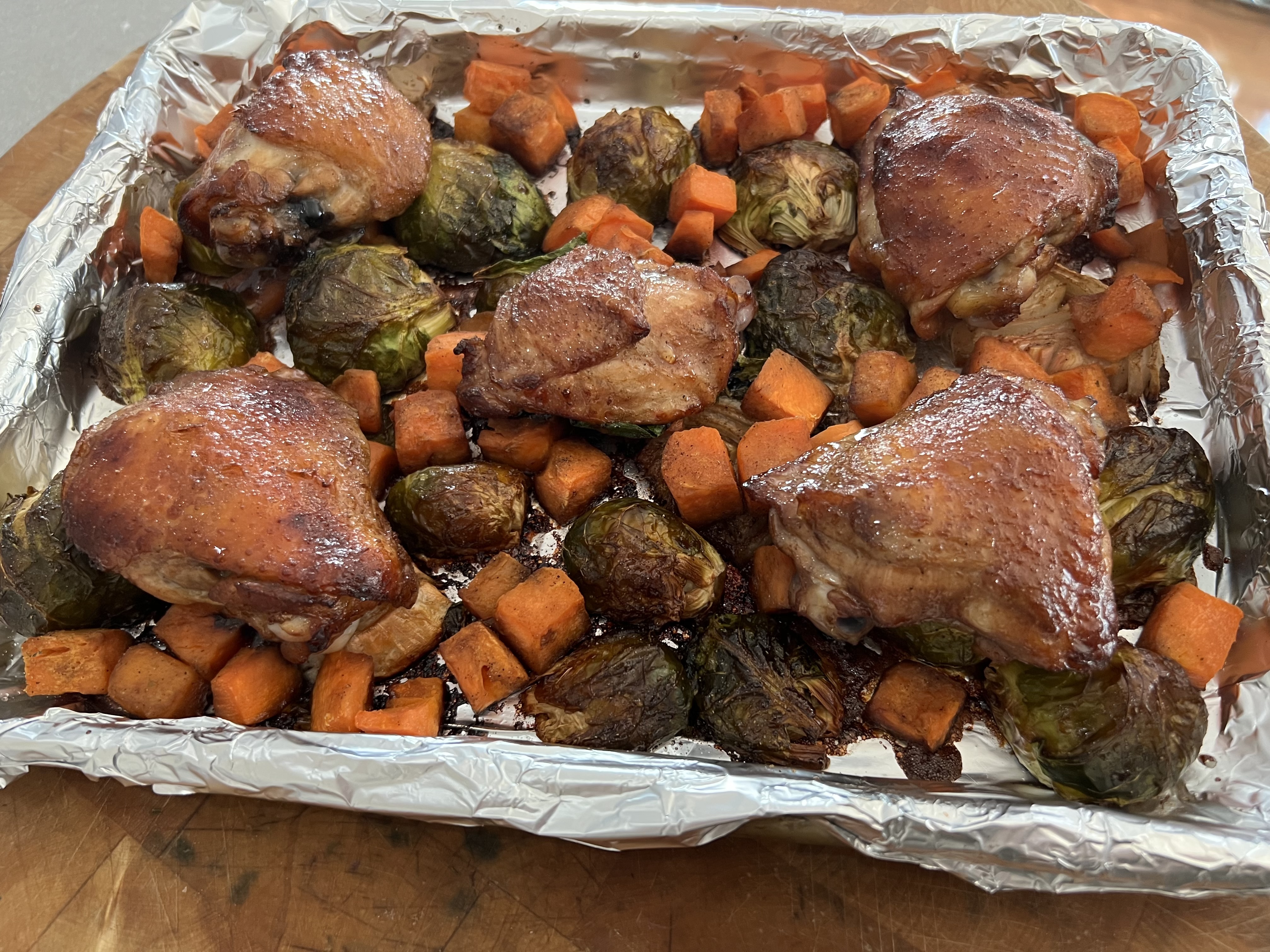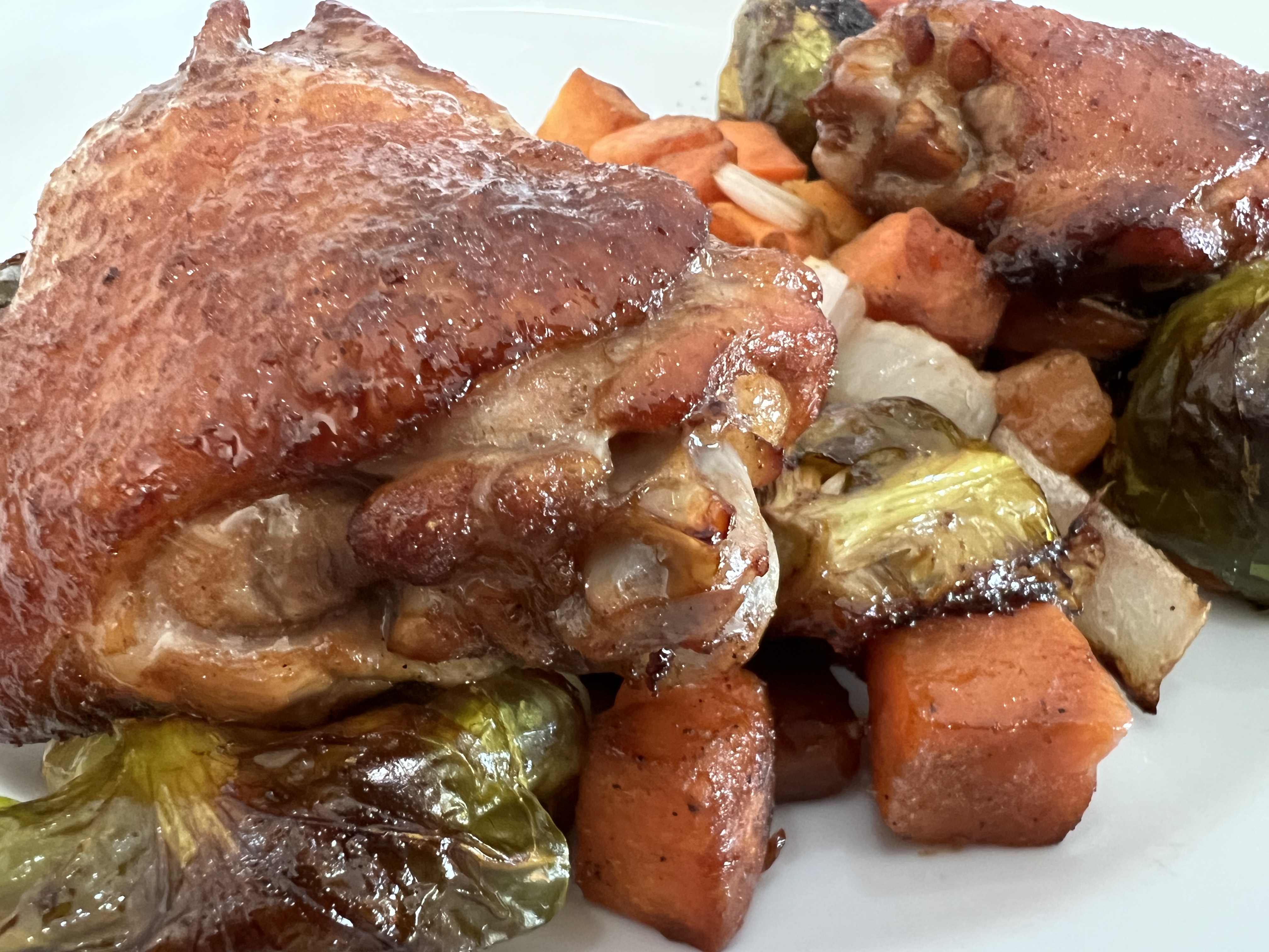 You can use any part of a chicken you like, even a whole spatchcocked chicken which would lay flat in a larger pan if you’re serving a group of people. But cooking for myself, I choose leg quarters (which are the thigh and drumstick together) or simply chicken thighs. They’re full of flavor, and have the fat content you need to drip down into the veggies below to flavor them as well. Something like chicken breast would simply be too dry.