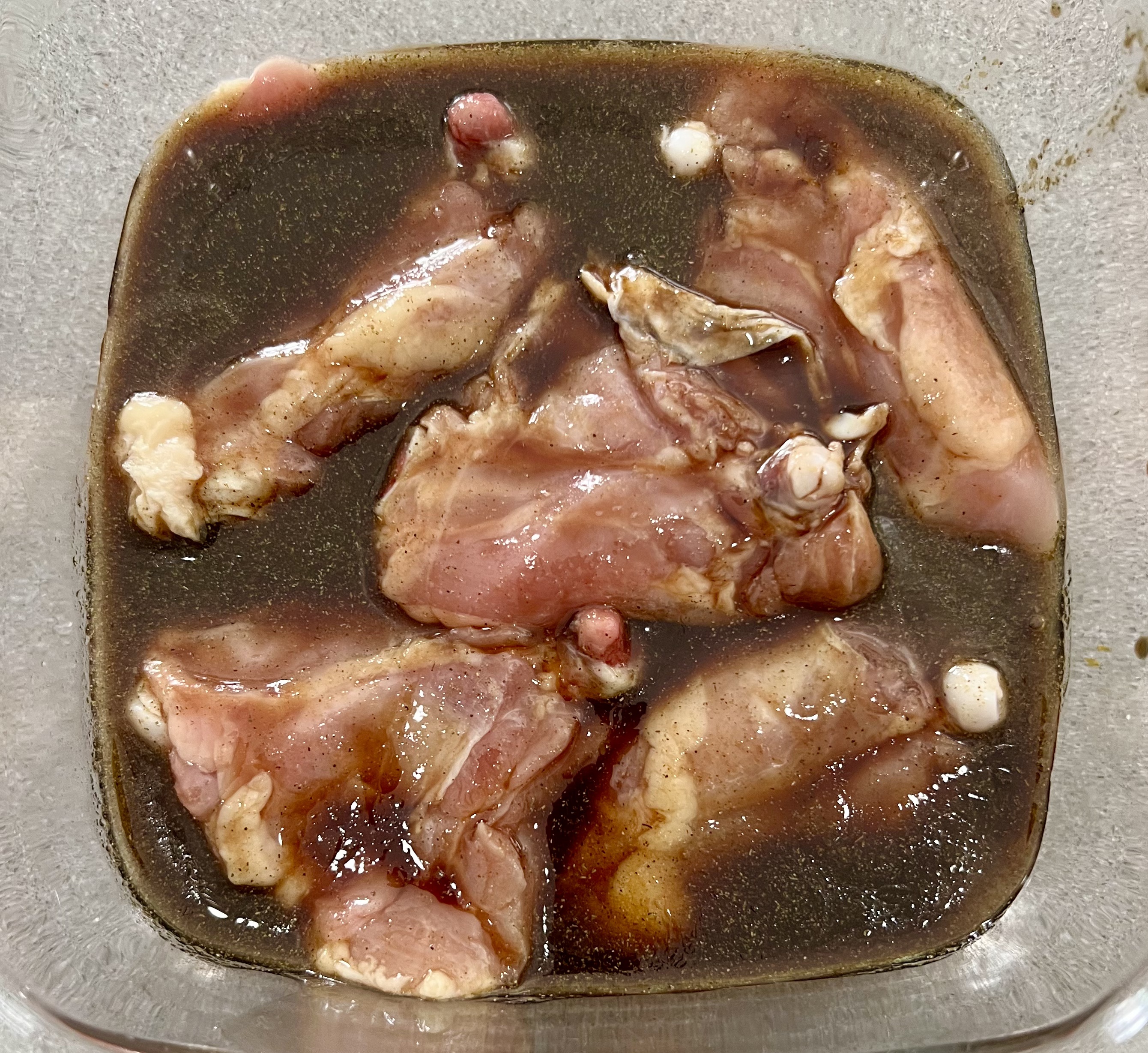 I buy humanely-raised pastured chicken, which means the birds are usually smaller than what you’d find in a supermarket (no steroid monsters here!), so one package contained 5 small chicken thighs. Once thawed, I placed them skin-side down in a glass container. Then it was time to make the marinade.