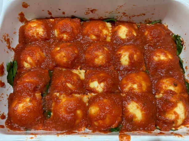 Dunk the raviolis in the sauce, then lay them on top of the spinach, one by one. Then pour the sauce on top of the raviolis. (If you use tortellini, you can mix them right into the sauce, because they’re sturdy.)