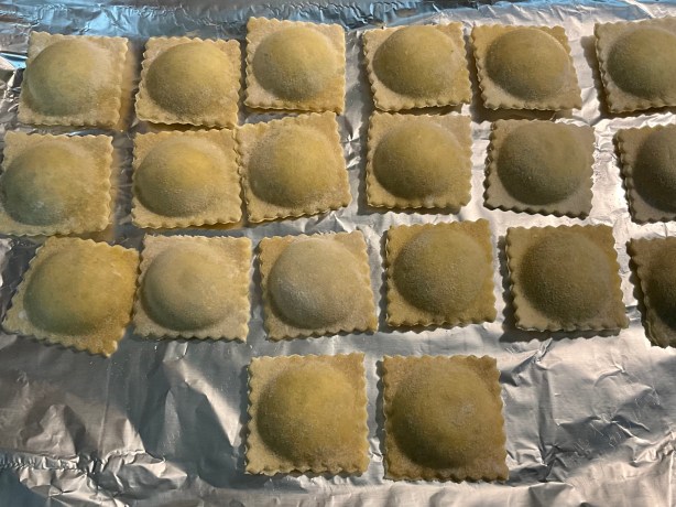 Thaw the raviolis, if frozen, by placing them on a baking sheet with non-stick foil. Cover them with plastic wrap to keep the moisture in to avoid cracking. (It’s not a big deal if they do.)