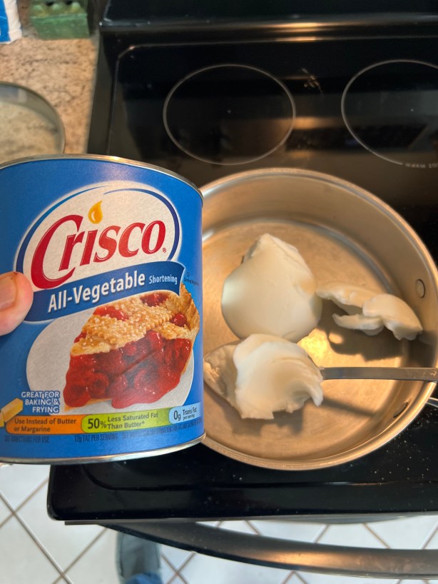 In a sturdy pot, melt about 2/3’s of the can of vegetable shortening. Most vegetable shortening has a smoke point of about 360°, so I don’t let it get past 350°. Keep an eye on it, and use a thermometer! You don’t want the shortening to burn.