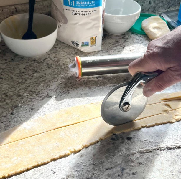 Once you’ve rolled the dough out into a sheet, cut it into 4-inch long, 1-inch wide pieces with a sharp knife or a pastry wheel. (I used a pizza cutter.) Traditionally, you make a slit in the center of each strip, and slip one end of the dough through the slit to get the desired “angel wing” form. I made a few of them that way, and then decided to leave the rest of them the way they are. (The gluten-free dough has much less elasticity than wheat dough.) Again, up to you.