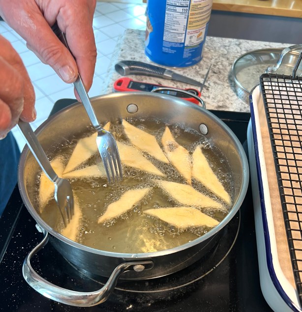The traditional recipe my mom and grandmother used for years featured vegetable shortening–good old Crisco–so I still use that, considering how rarely I make them. (It’s the only time I still use it!) But you can also fry them with the oil of your choice.