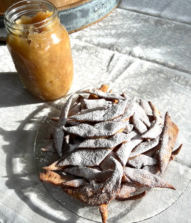 Krustai, also called Zagarėliai in Lithuanian (known as Chrusciki in Polish…and sometimes called Angel Wings), are basically strips of fried dough, sprinkled with powdered sugar. What makes them different than your basic funnel cake is that the recipe uses egg yolks to make the batter richer. They’re simple and absolutely delicious, especially if they’re served with homemade applesauce, the way my mom used to serve them to my daughter. (The recipe for that is at the bottom of this blog.)