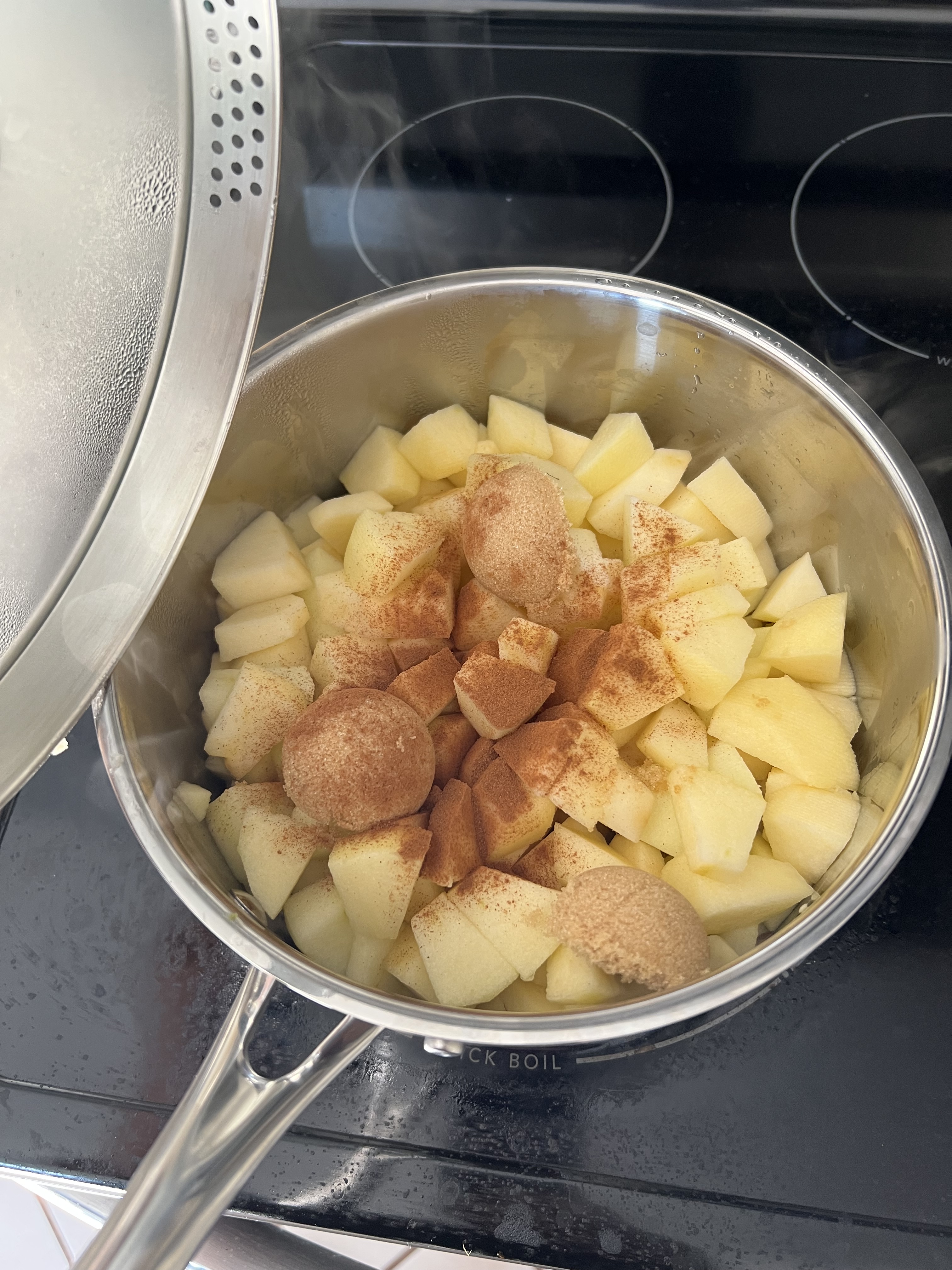 Peel and core the apples, cutting them into 1/2″ cubes. Combine them with the other ingredients in a large saucepan, and put it over medium heat.