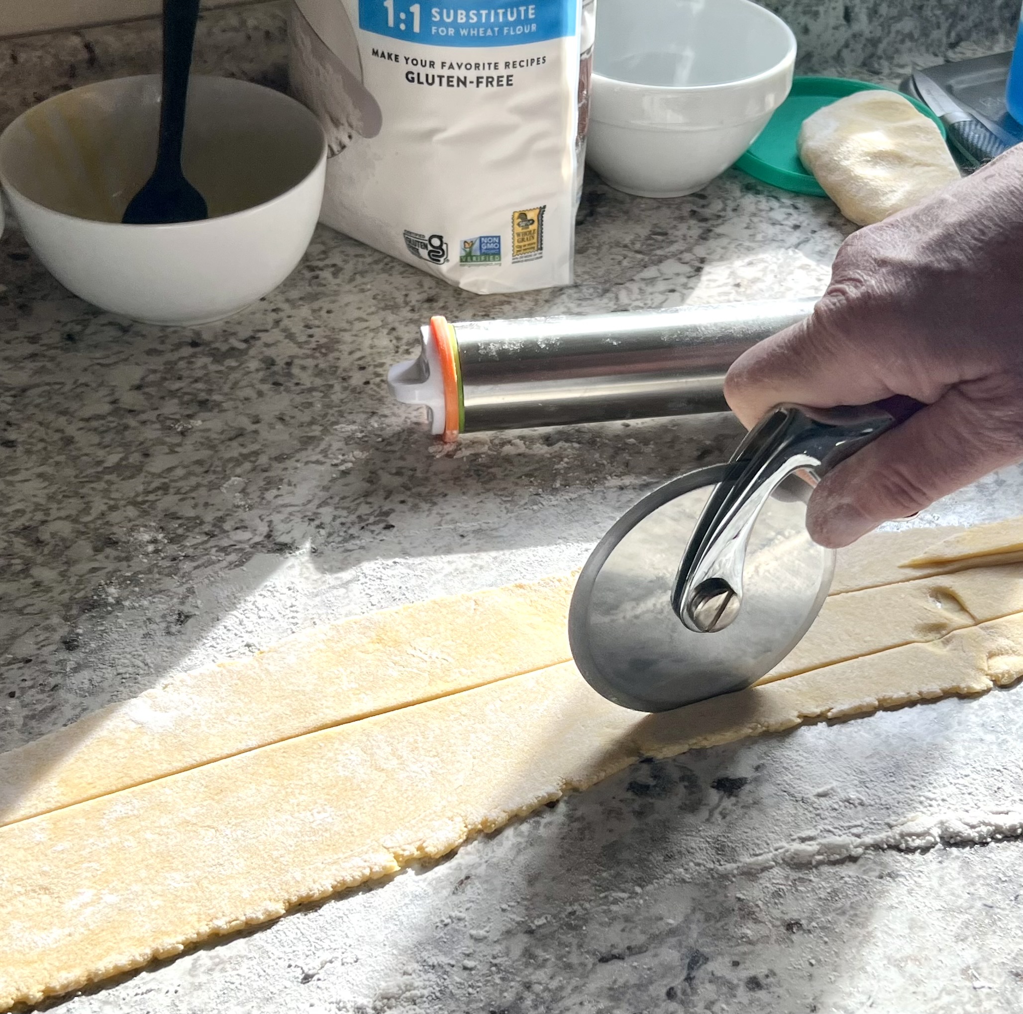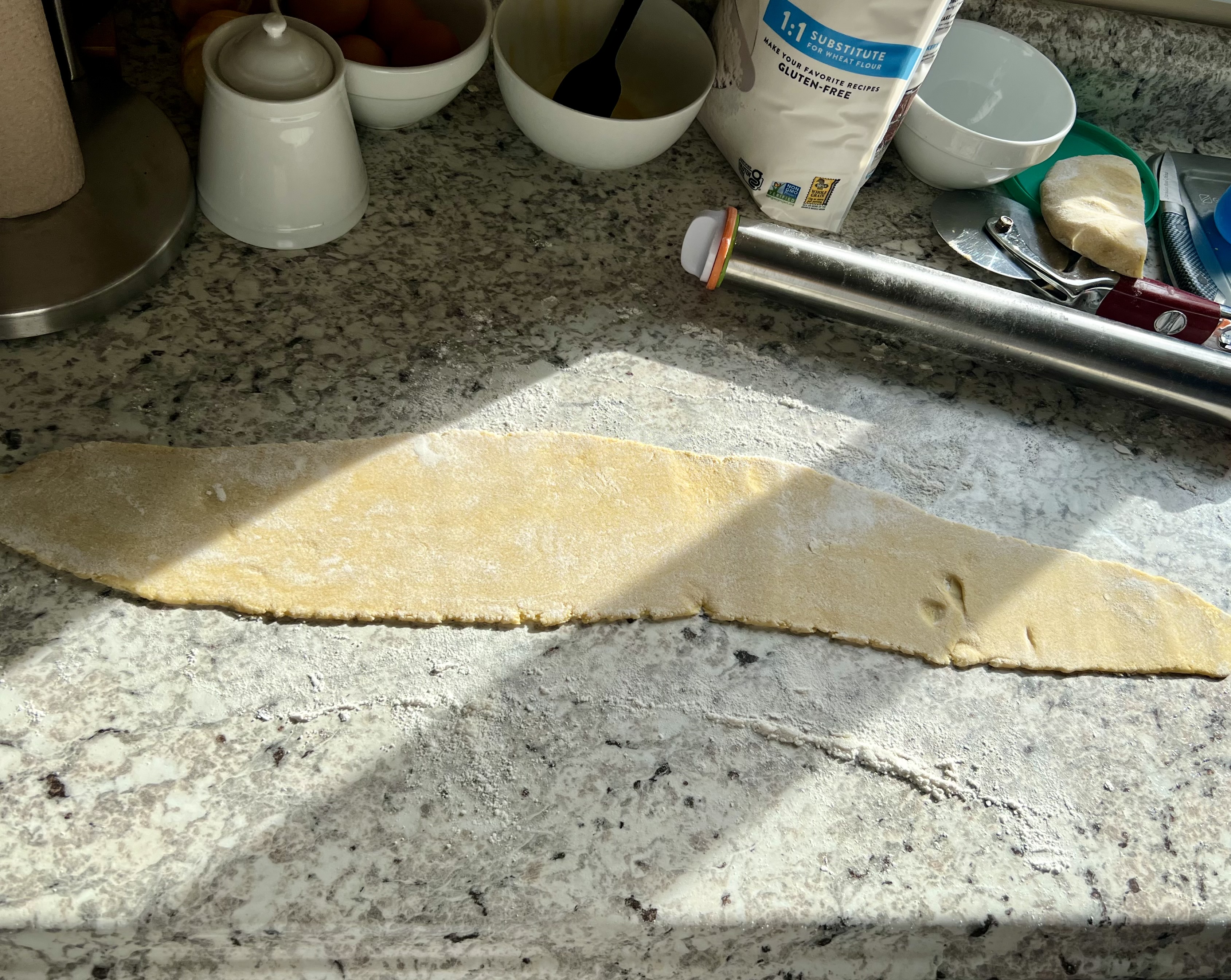 Once you’ve rolled the dough out into a sheet, cut it into 4-inch long, 1-inch wide pieces with a sharp knife or a pastry wheel. (I used a pizza cutter.) Traditionally, you make a slit in the center of each strip, and slip one end of the dough through the slit to get the desired “angel wing” form. I made a few of them that way, and then decided to leave the rest of them the way they are. (The gluten-free dough has much less elasticity than wheat dough.) Again, up to you.