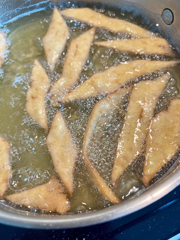 I use 2 forks to flip the pastry once it gets golden brown on one side. Once the oil temperature is right, the frying process goes quickly so keep an eye on your Krustai and don’t let them burn!