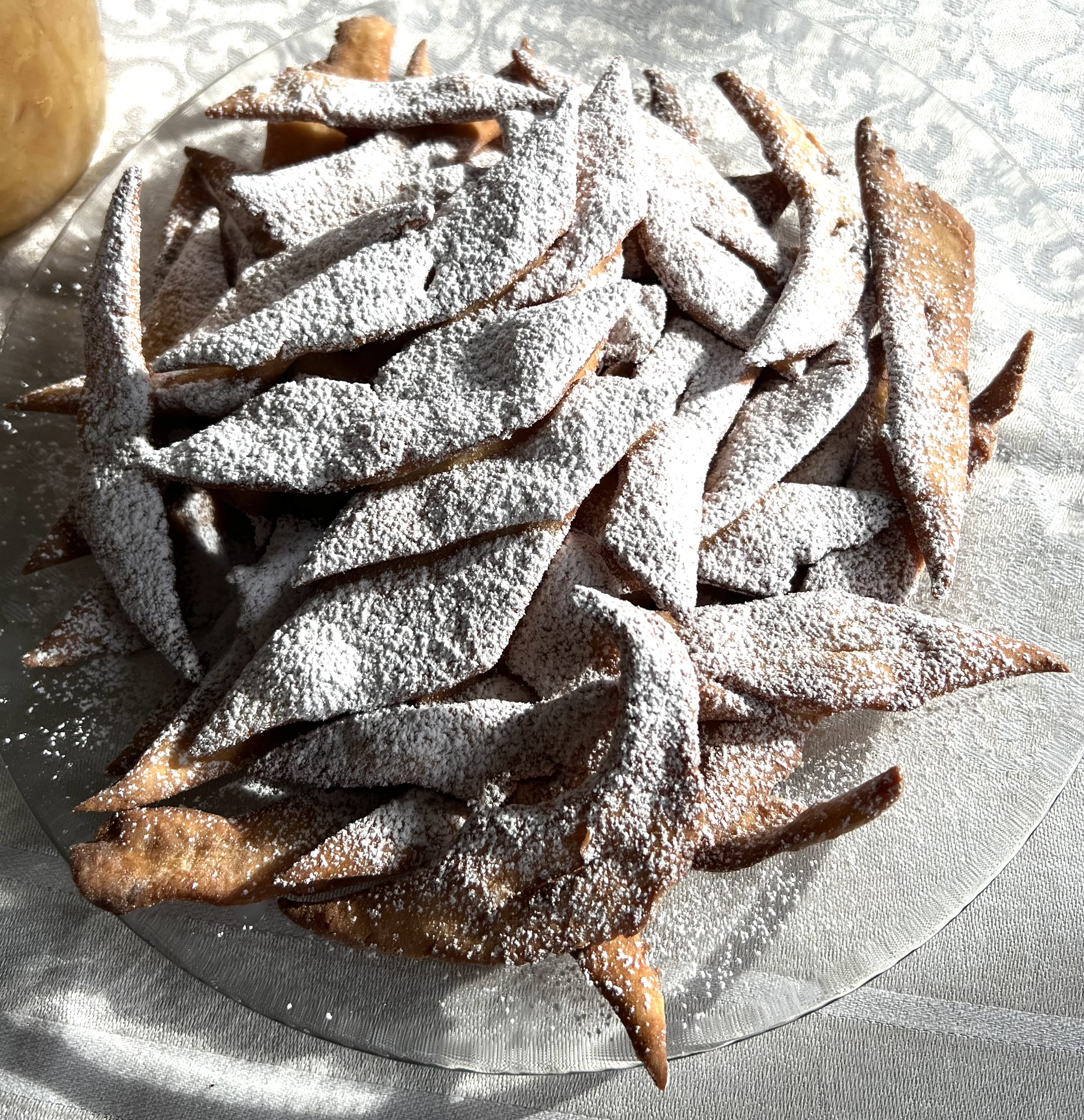 Krustai, also called Zagarėliai in Lithuanian (known as Chrusciki in Polish…and sometimes called Angel Wings), are basically strips of fried dough, sprinkled with powdered sugar. What makes them different than your basic funnel cake is that the recipe uses egg yolks to make the batter richer. They’re simple and absolutely delicious, especially if they’re served with homemade applesauce, the way my mom used to serve them to my daughter. (The recipe for that is at the bottom of this blog.)