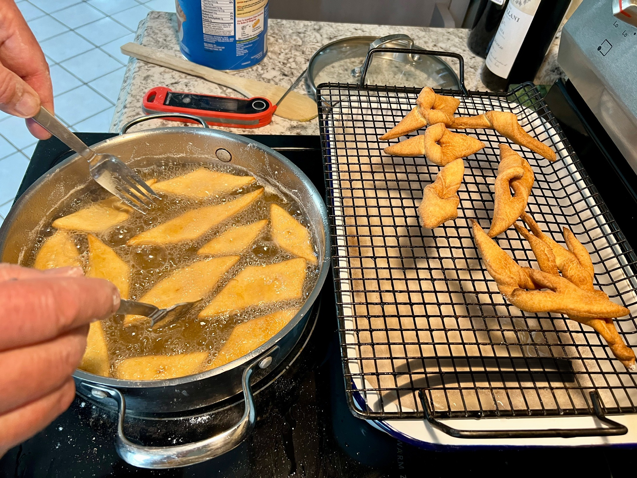 The traditional recipe my mom and grandmother used for years featured vegetable shortening–good old Crisco–so I still use that, considering how rarely I make them. (It’s the only time I still use it!) But you can also fry them with the oil of your choice.