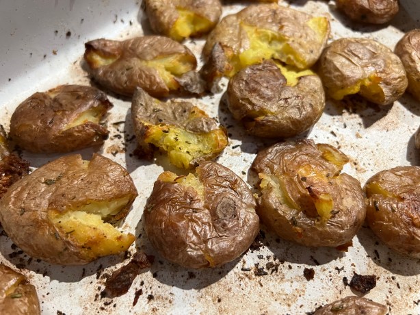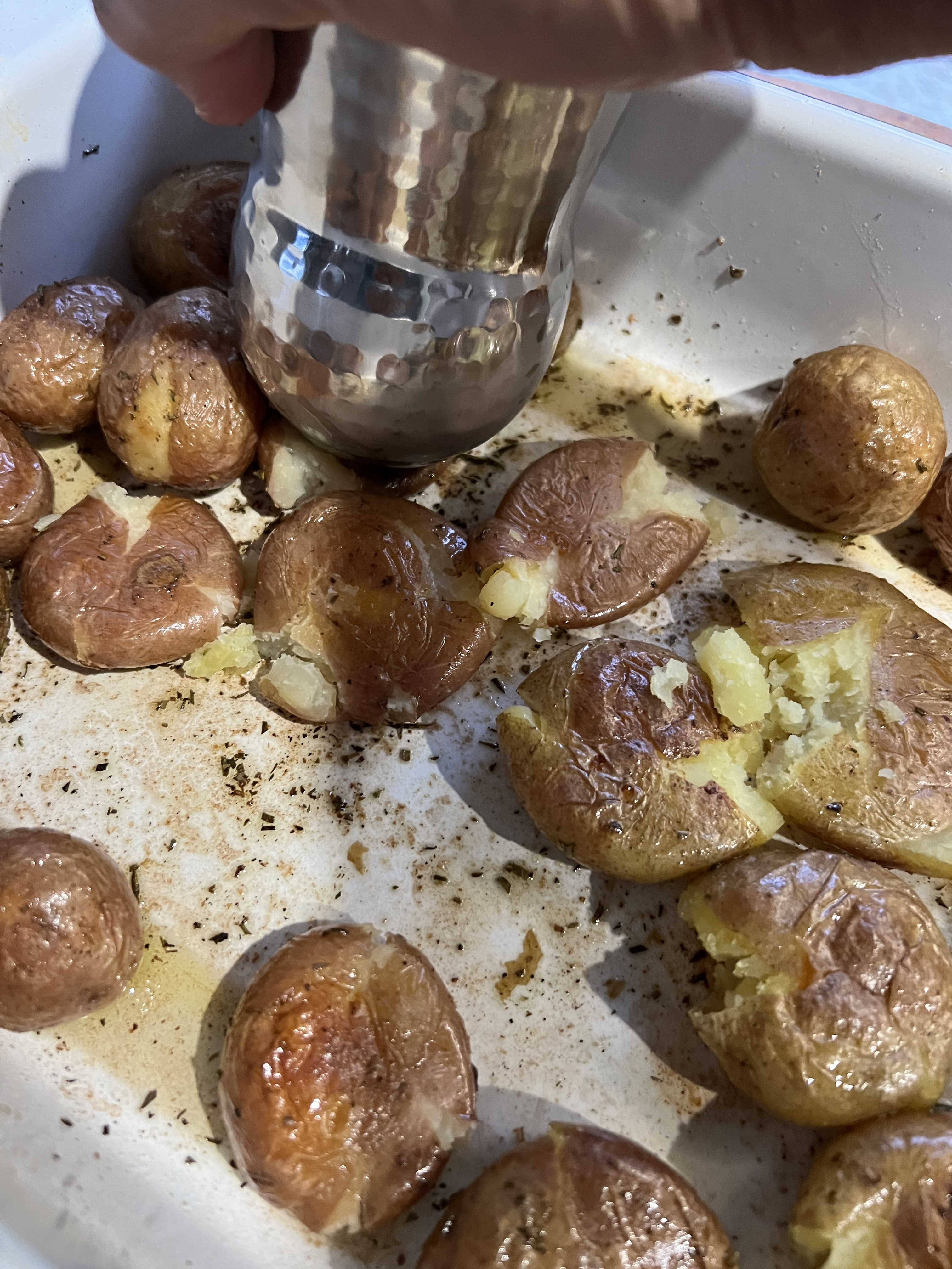 After 30 minutes, take the pan out of the oven and gently squash the potatoes with a flat object, like a glass. (I used my mint julep cup!) Toss them around again in the pan, and then return it to the oven for another 25 to 30 minutes.