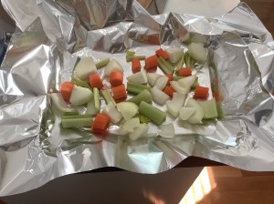 Place a small handful of this onion and celery “stuffing” mixture in the neck cavity of the turkey. Place the rest in the body cavity (where the stuffing would usually go.) You can fasten the bird with turkey skewers if you like. This “stuffing” is strictly to flavor the turkey…you don’t eat it!