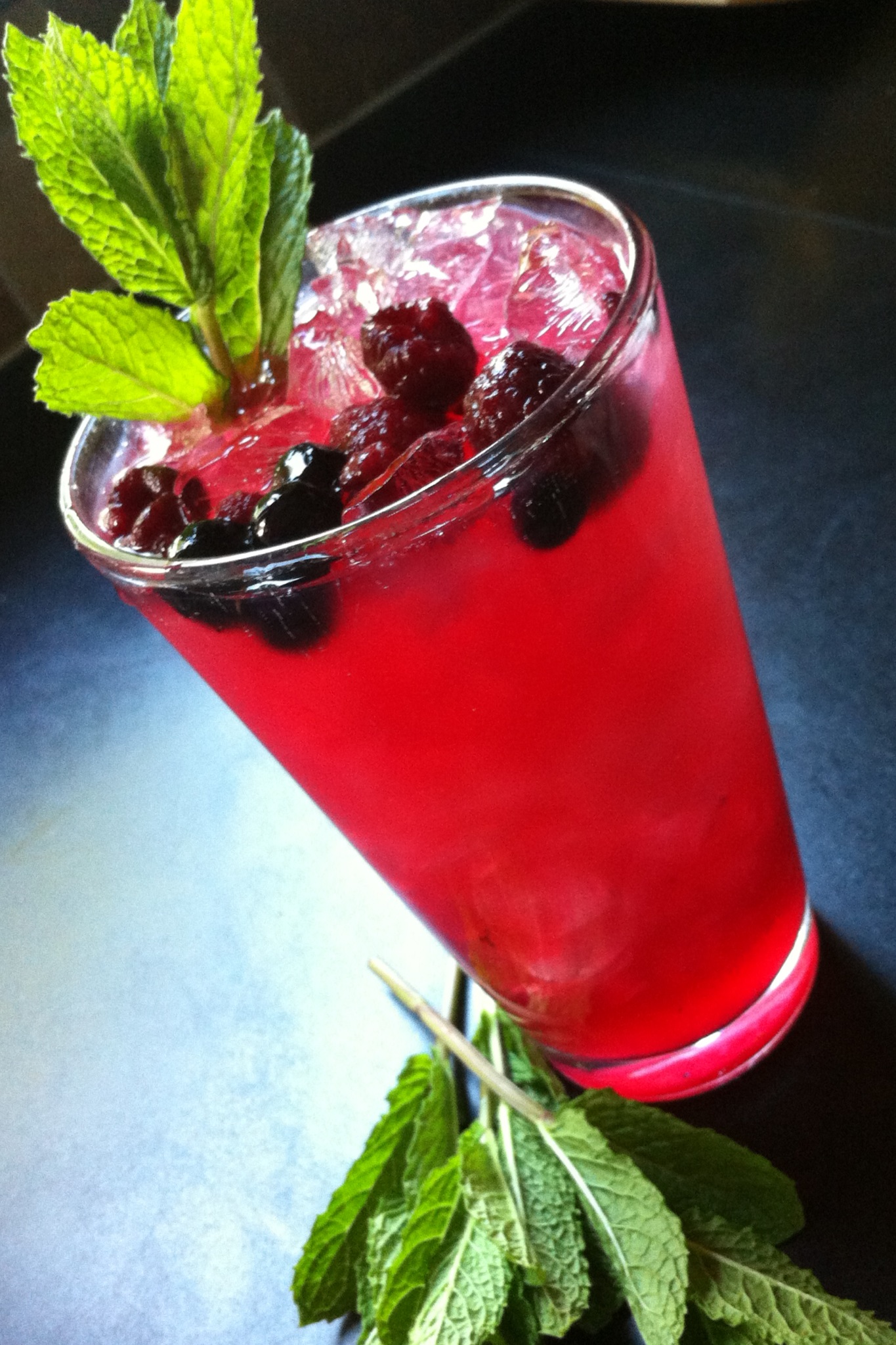 Or…for drinks one at a time, I put in a shot (1 oz.) of the sugar/lime mixture into a tall glass. I throw in about 8 mint leaves and muddle them for a minute. Then I add 2 shots of rum, and a few berries. I add ice, and I top it with the seltzer, stirring well. I garnish with a mint leaf.