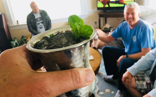 I like to add 1.5 ounces of bourbon, then the ounce of simple syrup, another 1.5 ounces of bourbon on top, and then a quick squirt of simple syrup to top it off. Break off a few mint leaves from the stem and push them into the ice. A beautiful layer of frost will form on the outside of the cup. Add more ice, if necessary, and garnish with a sprig of mint.