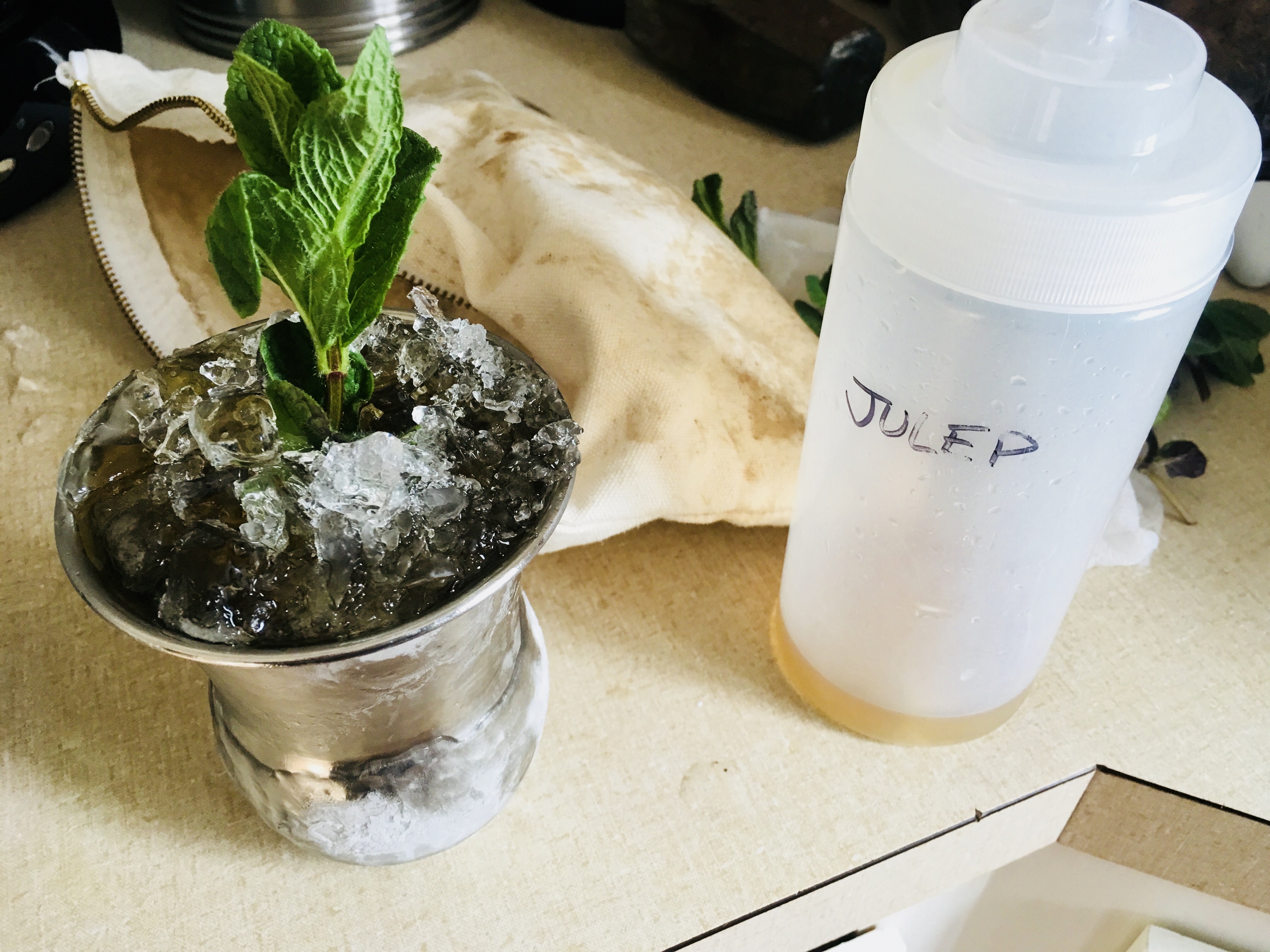 An equally important ingredient for a perfect Mint Julep is the ice: specifically, crushed ice from clean, filtered water. Don’t even think of using tap water for any cocktail much less this one. Why ruin an expensive bottle of bourbon by going cheap on the ice? I make my own ice cubes, then put them in an untreated canvas ice bag and bash them with a mallet to the perfect crushed size. But if you don’t want to go through all the trouble, just buy a bag of good ice. Untreated canvas bags for crushing ice can be purchased online from bar supply companies for about $30. I got an untreated canvas tool bag (the exact same shape and size) at Home Depot for 3 bucks.