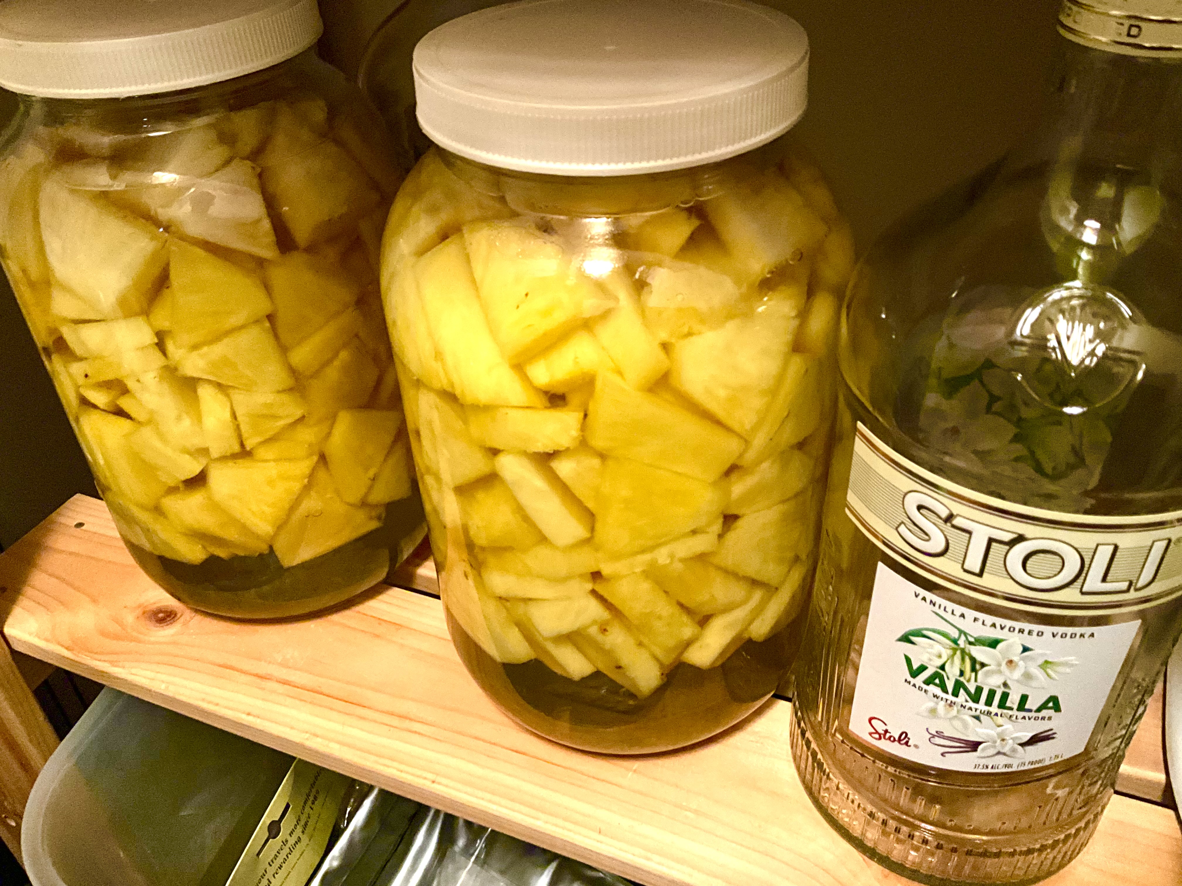 Find a gallon-sized glass jar with a lid. Peel, core and slice the pineapples and drop the pieces in the jar. Pour the vodka in, mix well, and seal the jar. Keep it at room temperature for 7–10 days, giving it a gentle shake every day.