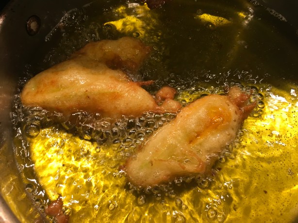 I heat a few inches of grapeseed oil (or any other high smoke point oil) in a pan to 325 degrees, then start the process: I stuff the blossoms, closing the flower petals around the stuffing, then carefully dip them in the pancake batter, and release them gently into the oil, flipping them as they fry, until they’re golden in color.
