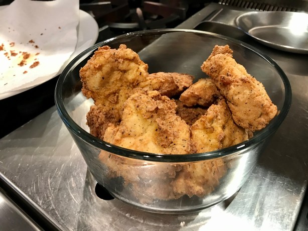 Fry the chicken in the oil until it’s golden brown. You want it cooked all the way through, but not overcooked. Place the fried chicken pieces on a wire rack to drain the oil. Do this with all the chicken. The fried chicken at this point is delicious all by itself: chop it and use it in a salad, or make a chicken sandwich. (By the way, if there’s breading left over, use it on the chicken tenders you cut off, and fry them up. My daughter gets these instead of store-bought chicken tenders, and she loves them.)