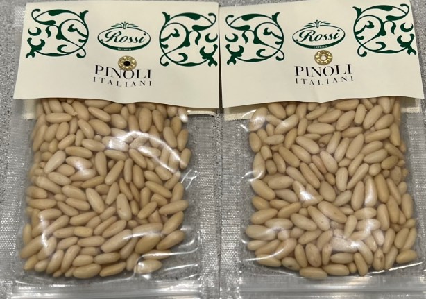 Real Italian pine nuts. Notice the elongated shape, versus a rounder one for inferior nuts. But at $15+ per ounce, they’re crazy expensive!