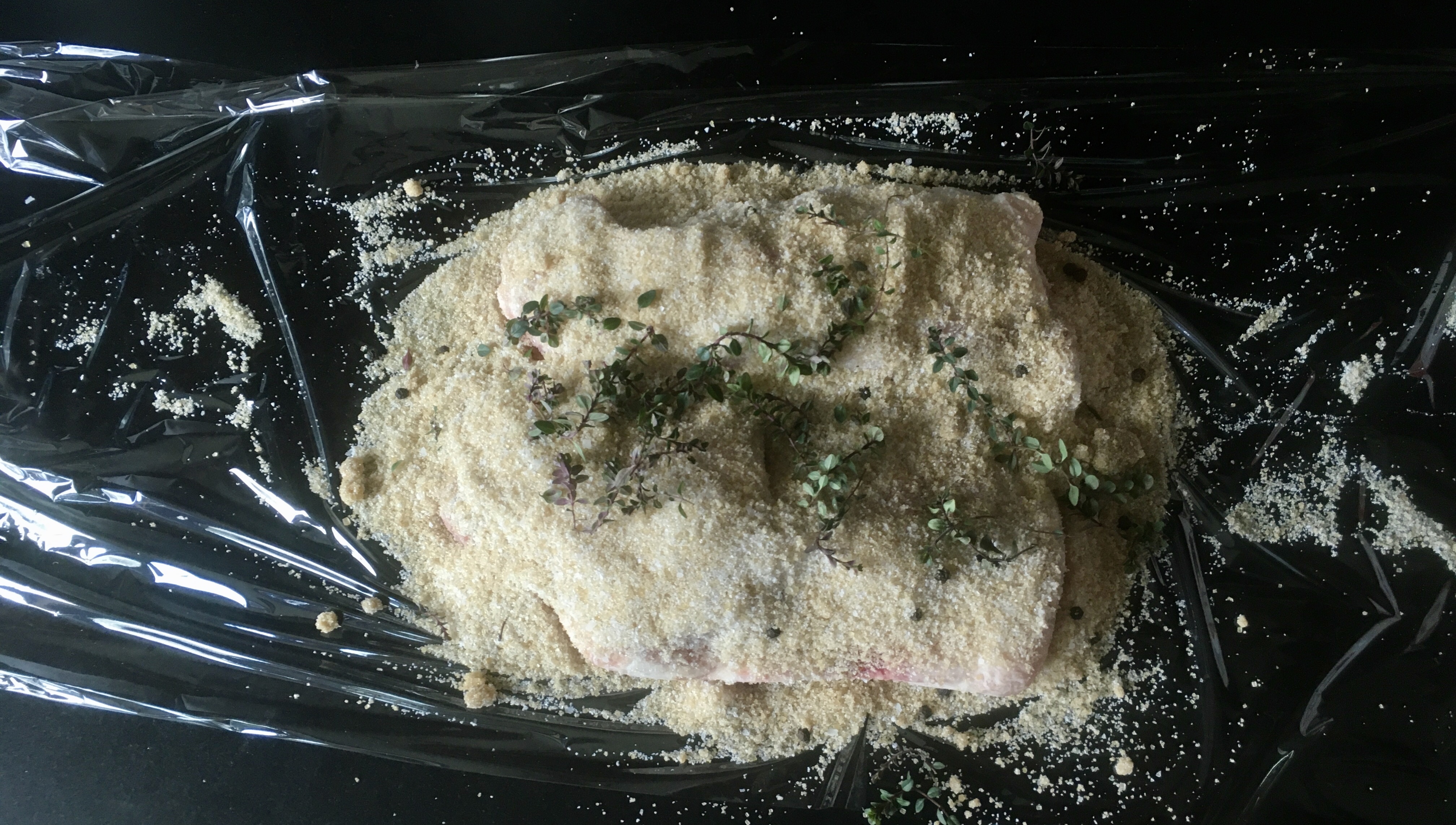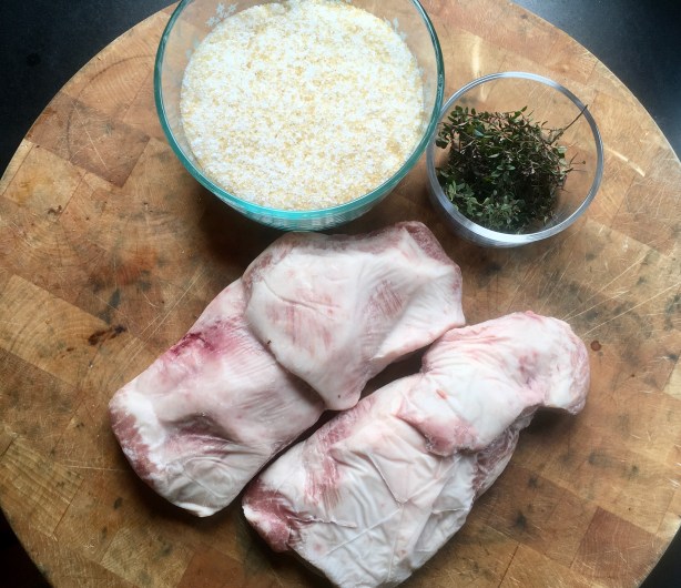 Berkshire pork jowls with fresh thyme from the garden and the dry cure mix.