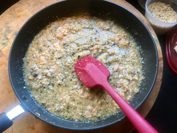 Steam the mussel meats until they’re just cooked. Remove the mussel meats, and reserve 1/2 cup of the broth. Pulse the mussel meats in a food processor, but leave ’em chunky…or chop by hand.