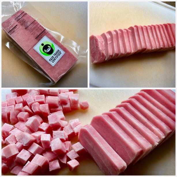 If the tuna is frozen, I let it thaw a little. If it’s fresh, I place it into the freezer for about 10 minutes to firm up. That makes it easier to cube up. I slice the tuna carefully into the smallest cubes I can make. Once done, I place the tuna in a bowl and put it back in the fridge to continue its slow thawing until ready to use.