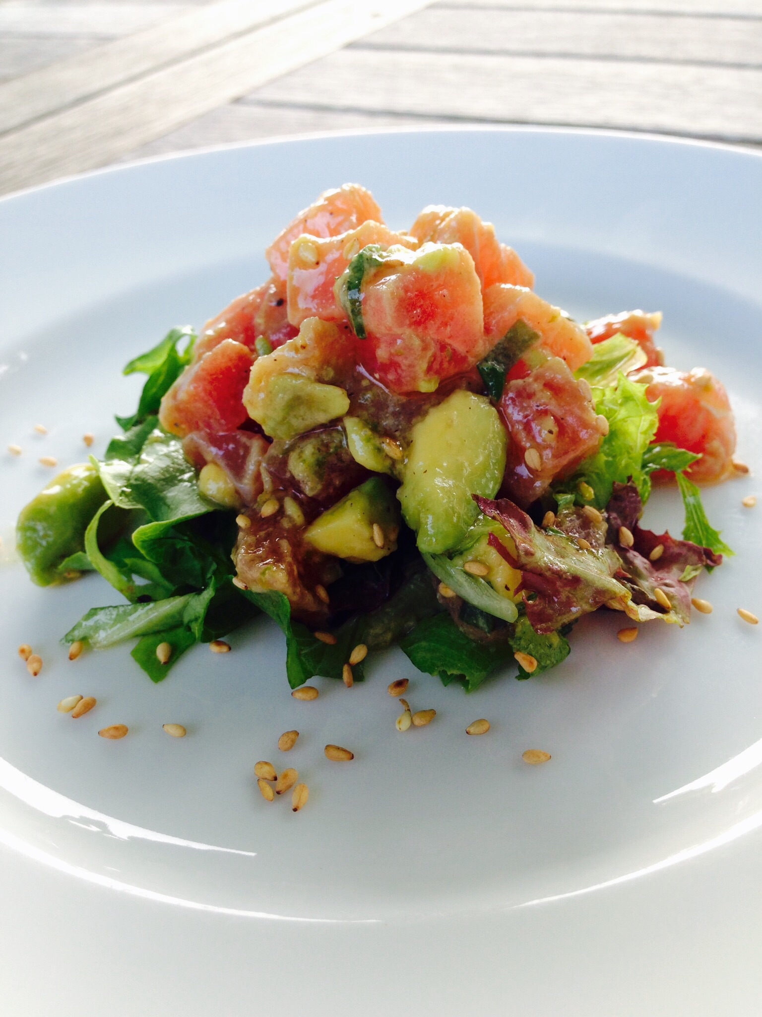 Add this mixture to the bowl of tuna and combine gently. Let it sit in the fridge for at least an hour for the flavors to combine. Before serving, take the bowl out of the fridge and let it warm just slightly. Taste for seasoning. Top with optional sesame seeds.