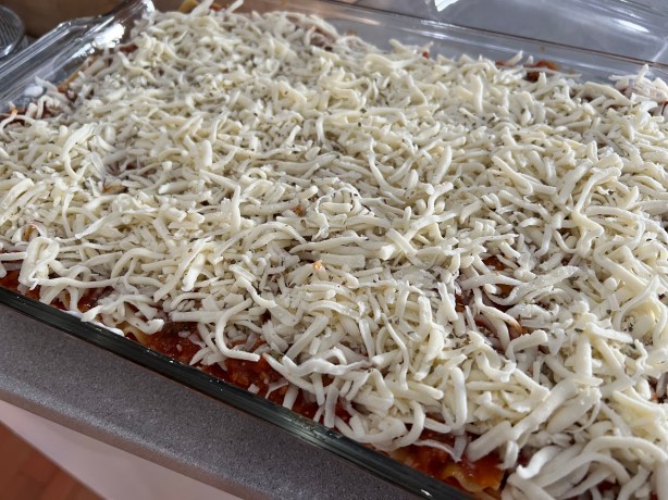 A little more meat sauce on top, followed by a layer of bechamel, and a light sprinkling of mozzarella.