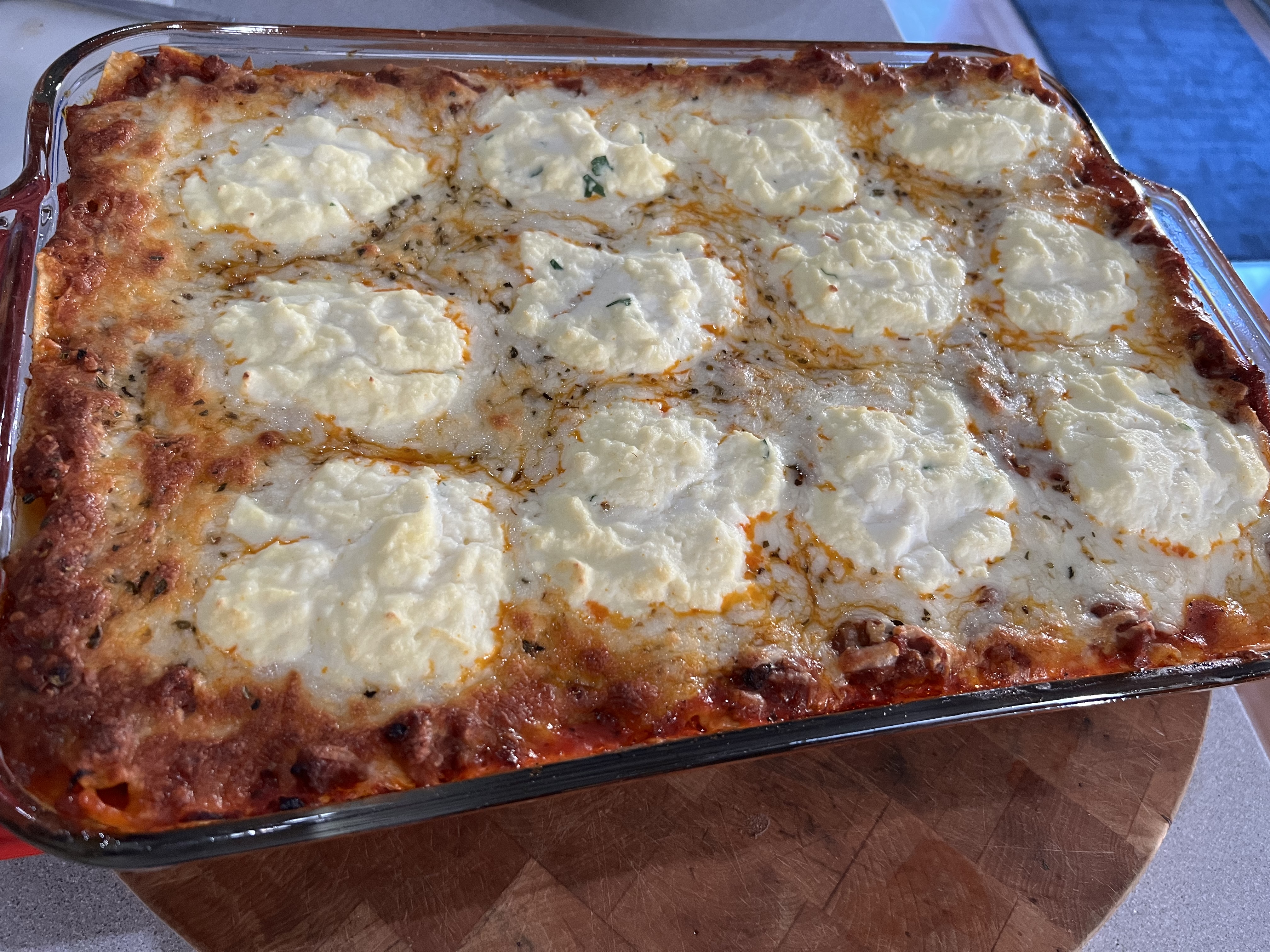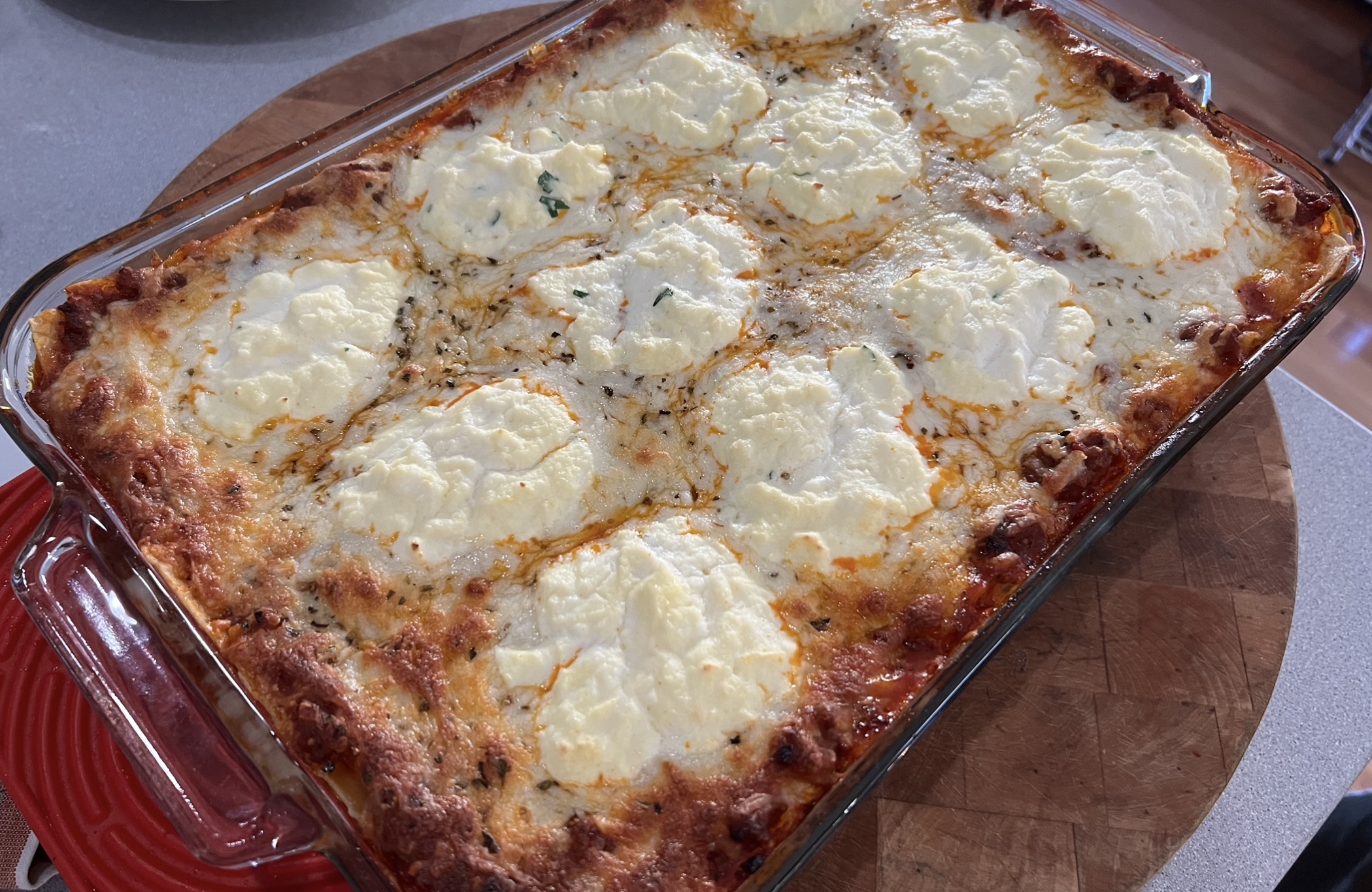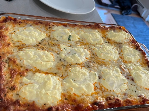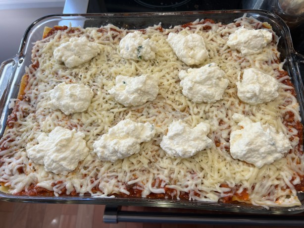 Next another layer of slightly overlapping lasagna sheets. More meat sauce…more bechamel…more mozzarella. And now a layer of the ricotta mixture.