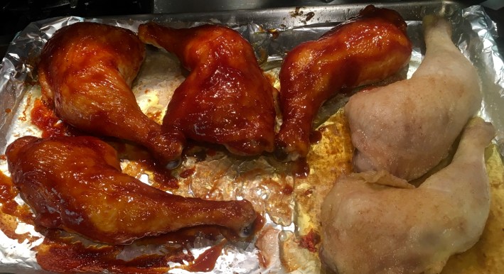 I’ll bake the chicken for about an hour, taking the sheet pan out of the oven to brush the barbecue sauce on the pieces before returning to the oven again, now bringing the temperature up to 300 degrees. (Because there’s sugar in the barbecue sauce, I don’t want to crank the heat or it will burn.)
