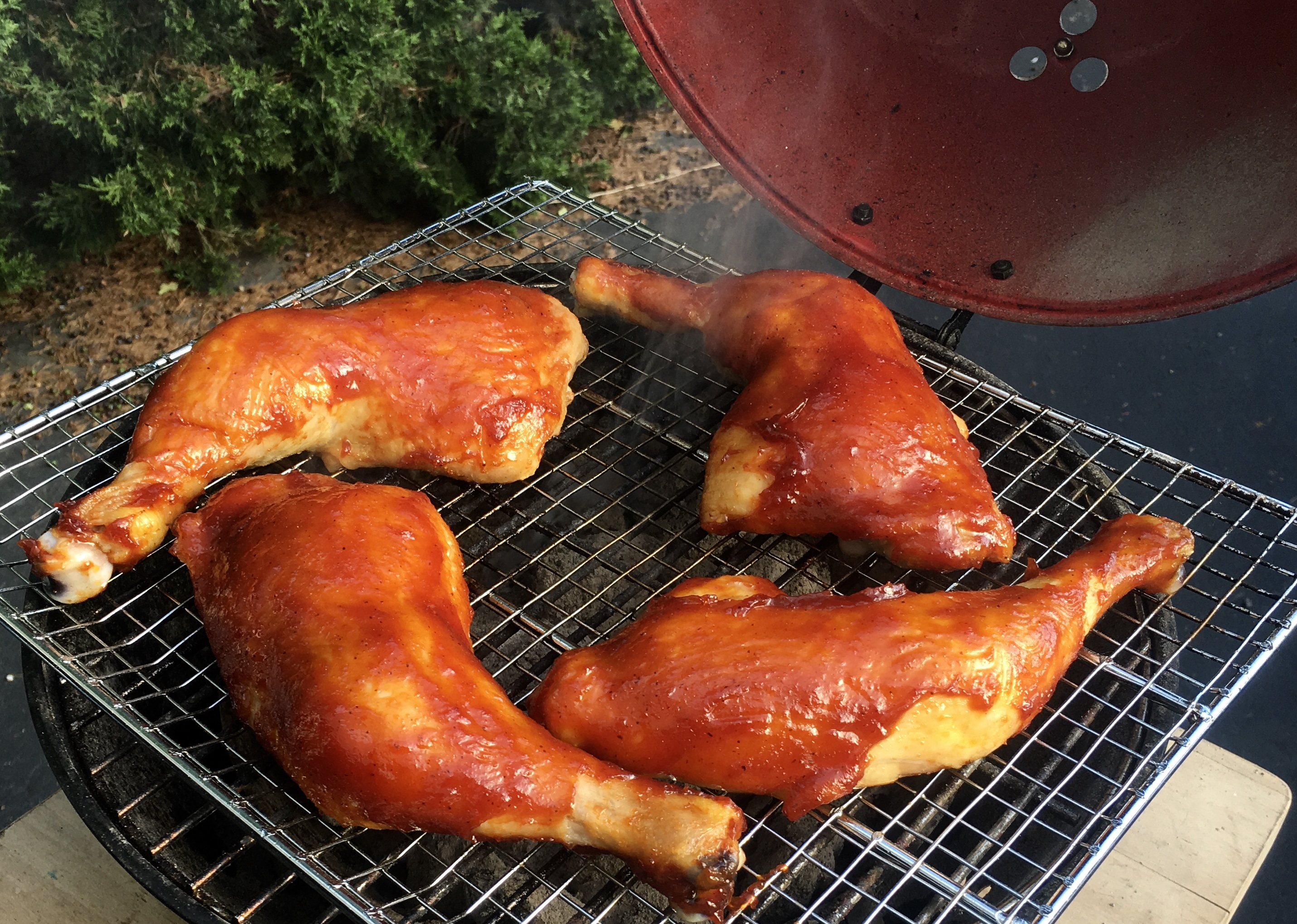 The chicken goes back to the kitchen, and while it’s still hot, I brush with the barbecue sauce one last time before serving.