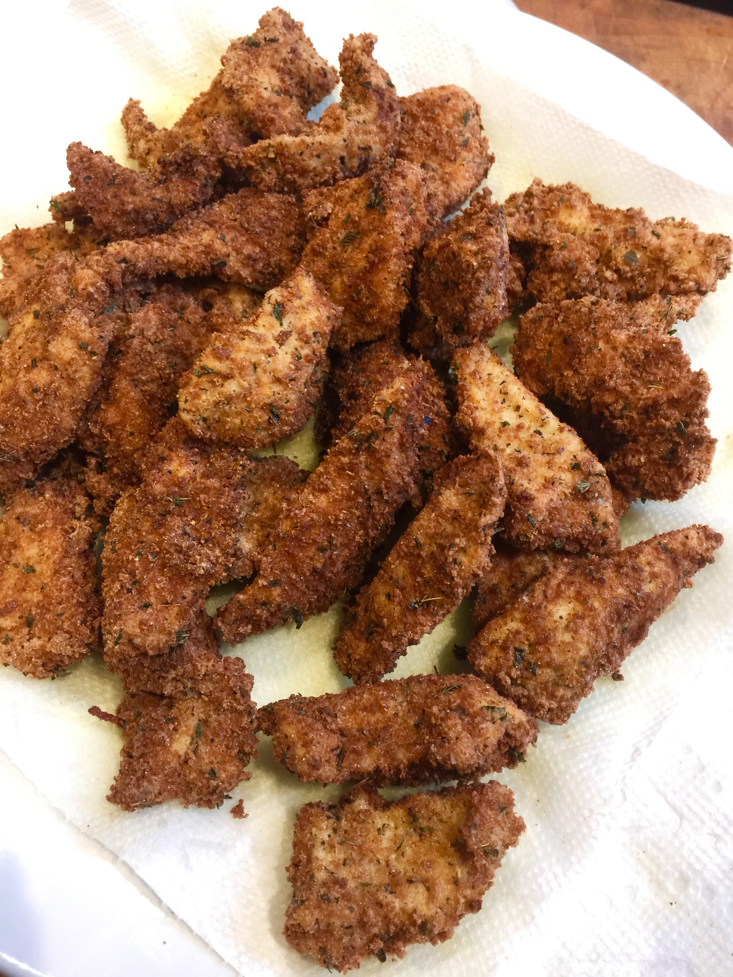 The breading for the chicken is bread that I’ve toasted, crumbled and put into a food processor to make breadcrumbs. I get a lot more flavor this way than using store-bought breadcrumbs from a can. I add flour to it to lighten it up.