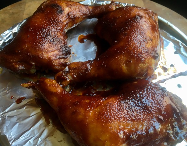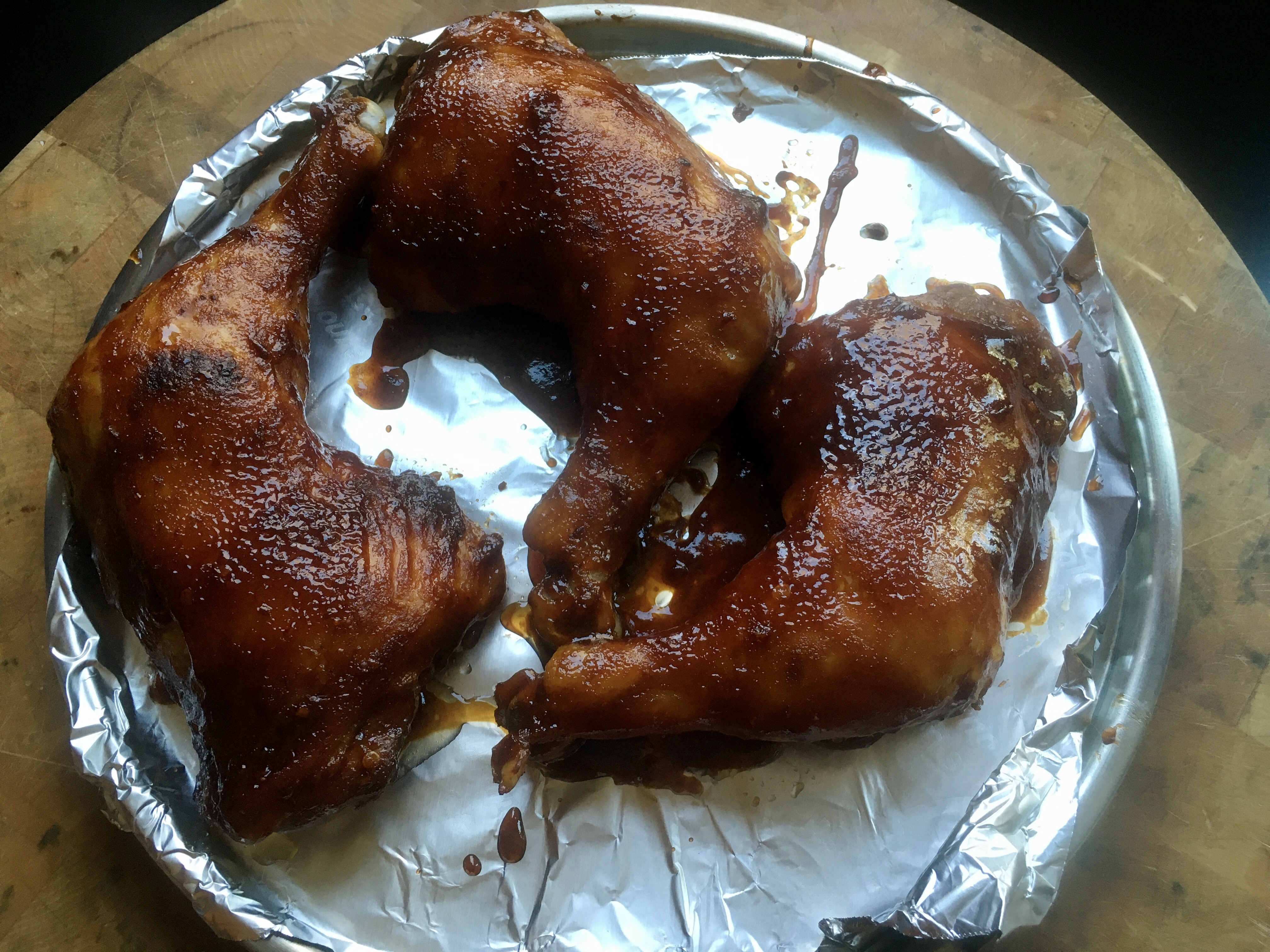 Carefully pour off the fat, then brush more of the sauce on the chicken, and place it under the broiler, watching it carefully so that the sugars in the sauce don’t burn. Broil it until it’s caramelized. (Another option is to light a charcoal grill and cook it on the grill rather than putting it under the broiler. It’s just a matter of how much time and effort you want to spend, and what the weather’s like.)
