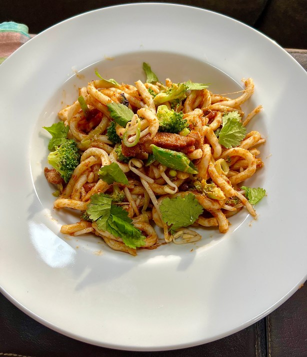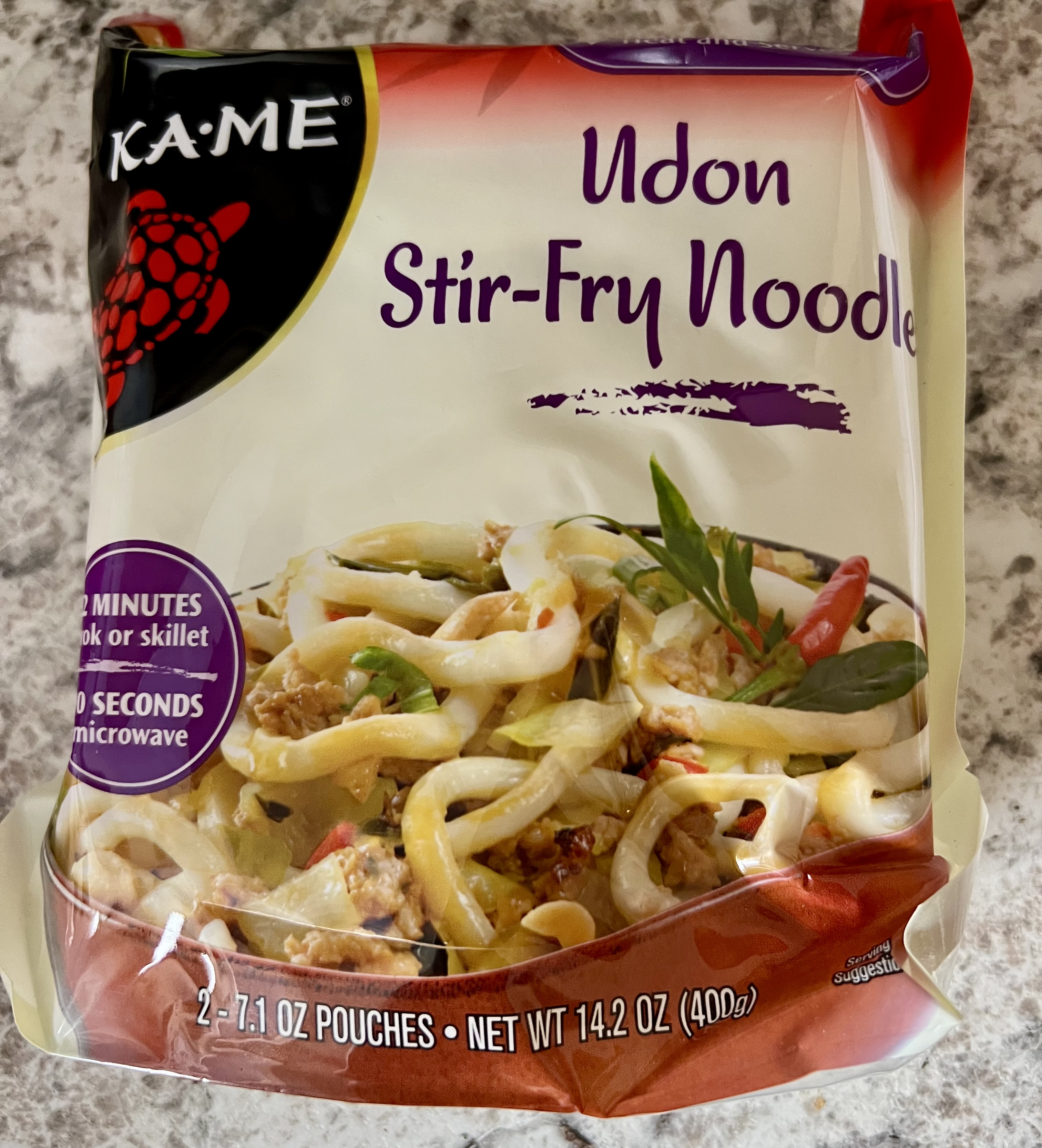 This time, I used Udan noodles for this dish (by my daughter’s request) and I found a brand that simply needed to be microwaved for 90 seconds before using.