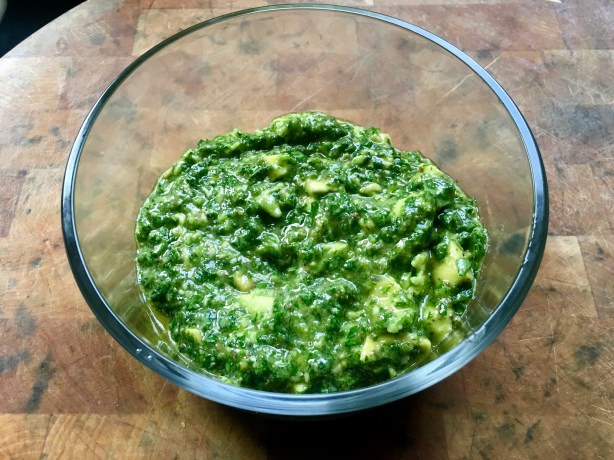 Combine the chicken, breadcrumbs, chopped avocado, salt and pepper, and garlic in a bowl and mix them thoroughly but carefully so that you don’t squash the cubes of avocado. I like to put the meat in the freezer for about 10 minutes to firm it up a bit.