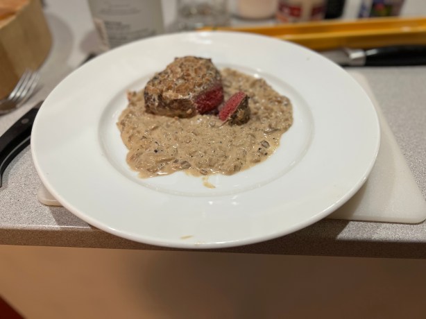 Although I had my probe set at 120°, I took the meat out at 115°, removing the roast from the pan, and placing it on a cutting board (or another clean pan.) Then I wrapped the roast with foil, and covered the foil with a clean bath towel, keeping all the heat in, letting the meat rest for AT LEAST 30 minutes. The meat inside continued to cook and reached a temperature of 130° before it started to slowly cool down. (If you leave the probe in while the meat is wrapped, you’ll actually see the temperature rise.)