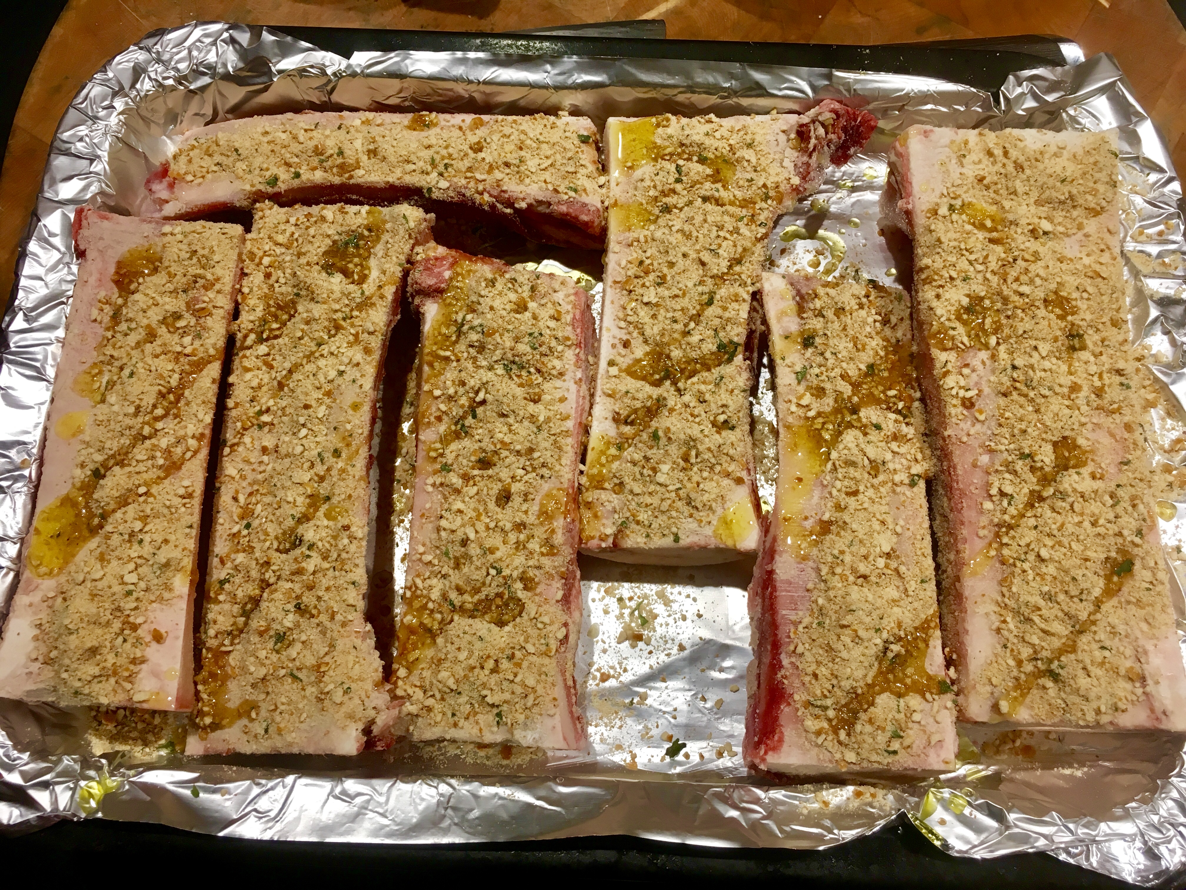 Combine these ingredients in a bowl. You want it to be like a paste or wet sand. If it’s too dry, add a little more olive oil. Dried oregano and thyme are usually fine the way they are, but fresh rosemary from the supermarket can be hard like pine needles. I either chop them really fine or I put them in a spice grinder. I have a small rosemary plant growing indoors by my window, so the needles are usually soft and wonderfully fragrant when I chop them up.