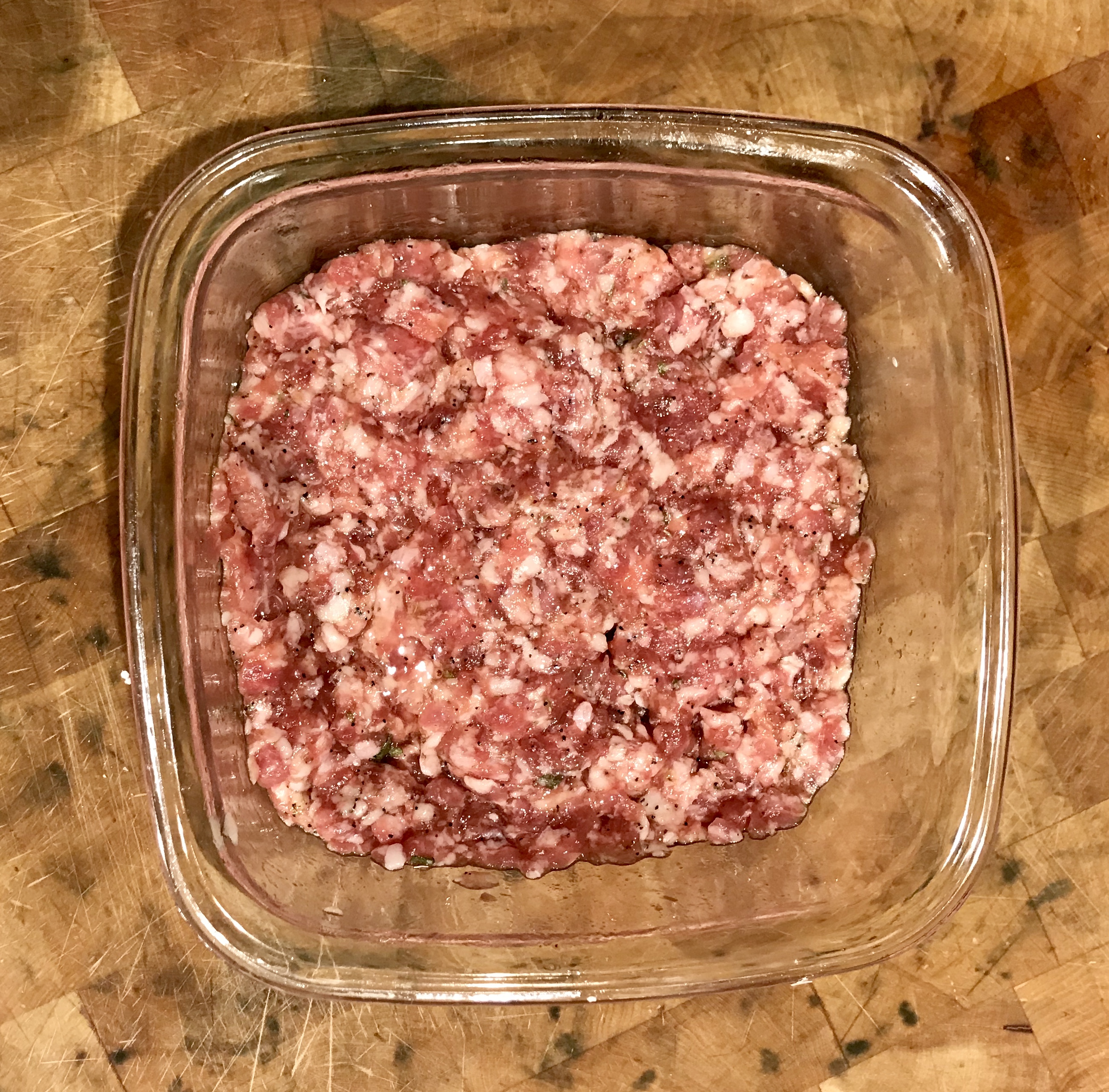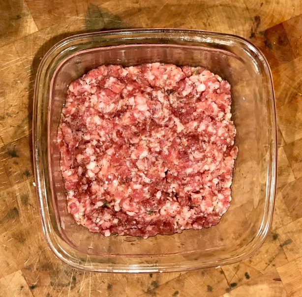 Combine the pork, the seasonings and the egg in a bowl and mix well. Place the bowl in the fridge for at least 15 minutes to let the meat rest. Overnight is even better. (Do it the night before, and you’ve got it all ready to cook the next morning with your eggs!)