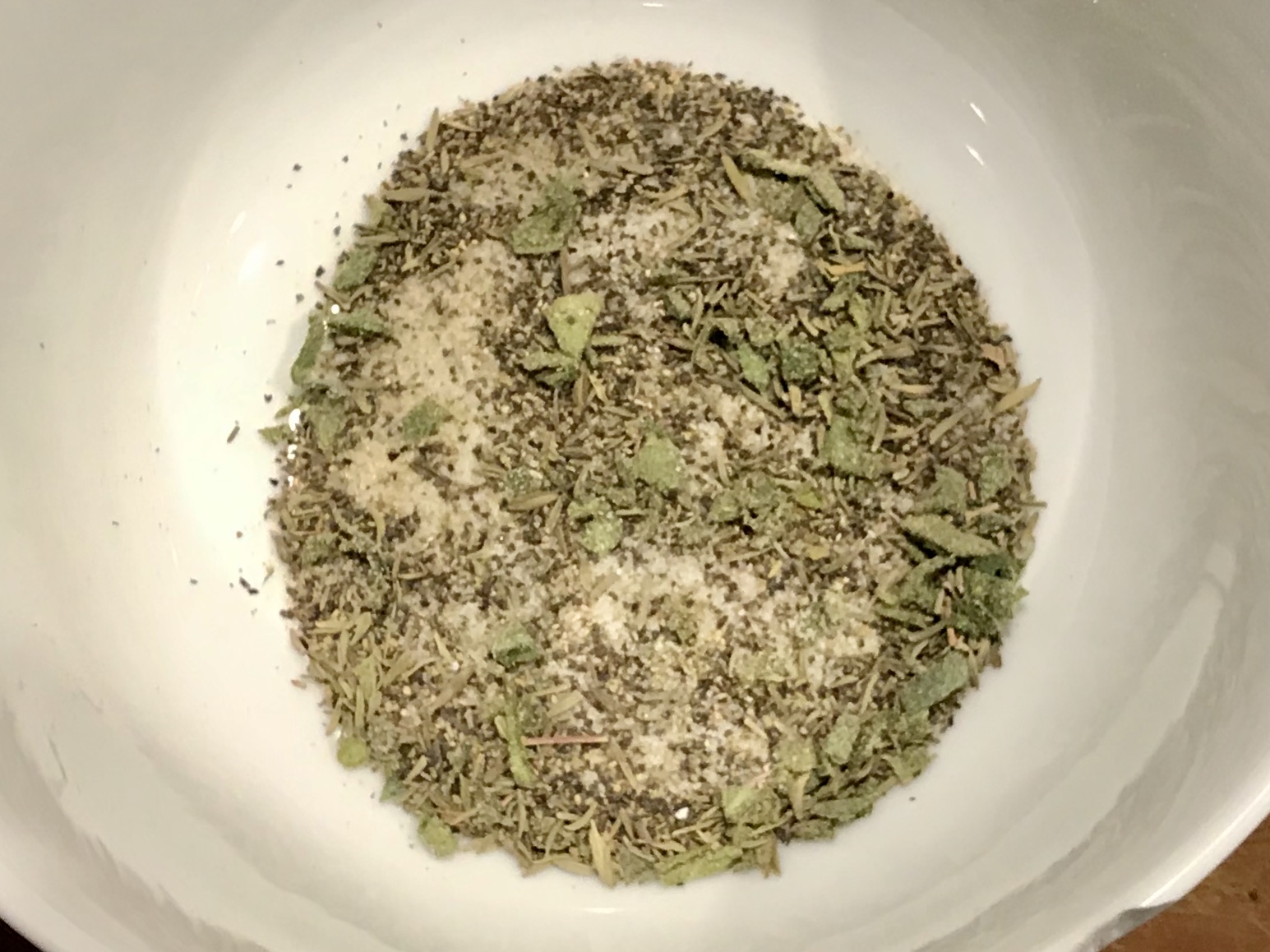 I like to combine the salt, pepper, sage, rosemary and thyme in a bowl first, mixing them together well. That way, when I’m seasoning the pork, it’s all evenly distributed.