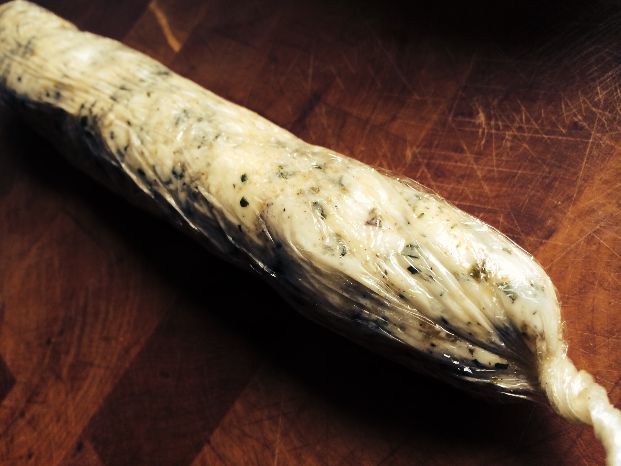 I went one step further. If having herbed salt is a great idea, then having herbed butter at the ready has to be even better! I simply took a stick of unsalted butter out of the fridge and let it soften. (Use unsalted butter or the result will be way too salty.) I added one tablespoon of the herbed salt to the butter and mixed it in well. Then I placed the butter on a sheet of wax paper, and rolled it into a small log, twisting the ends of the paper to seal it, placing it in a plastic bag and into the freezer.