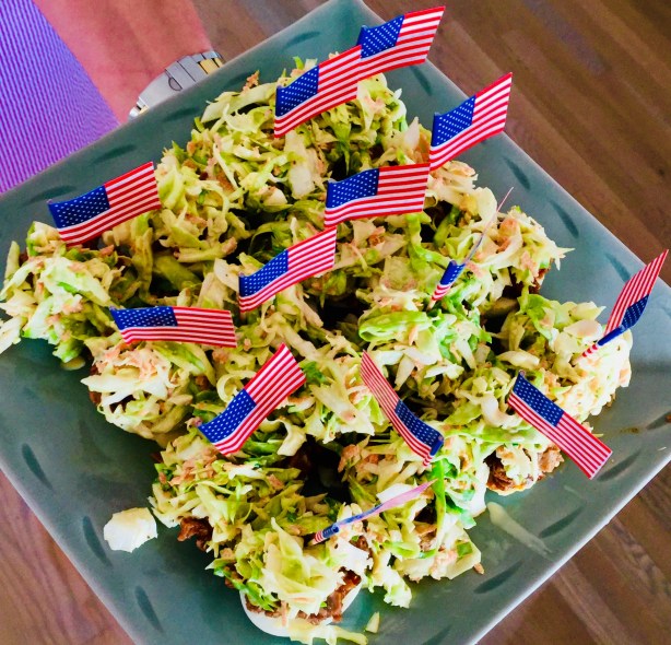 I boil the eggs and make the cole slaw the day before, then keep them in the fridge. Even the chicken can be cooked the day before and then warmed through before assembling right before you need it. Be sure to make a lot of them…they’ll go faster than the hard-boiled eggs in “Cool Hand Luke!”