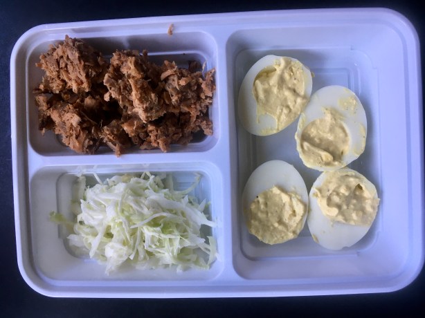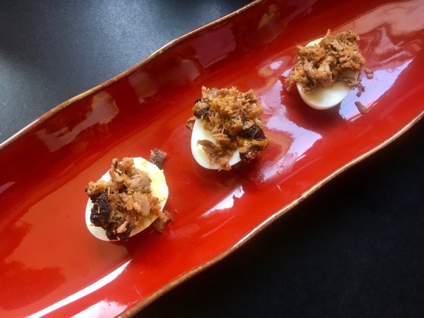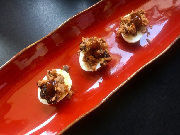 It’s easy to set up the parts, then put it together quickly as needed. I even put a to-go package together. If you know what a pulled pork sandwich North Carolina-style is all about (pulled pork on a bun with cole slaw right on top of the meat), then imagine taking away the bun and replacing with a deviled egg! It’s messy, it’s delicious, and everyone loves them.