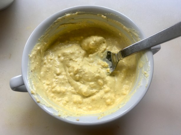 Once the eggs have cooled, I peel them and cut them in half. I scoop out the yolks and place them in a bowl, starting with 1/4 cup of the mayonnaise, adding more if needed. I use a fork or whisk to get as many of the lumps out as possible. If I wanted to get serious, I could put them in a blender or food processor to make a creamy puree. An option is to place the puree in a piping bag and carefully squeeze it out into each egg half. I’d do that if I was serving guests. But otherwise, I simply use a spoon.