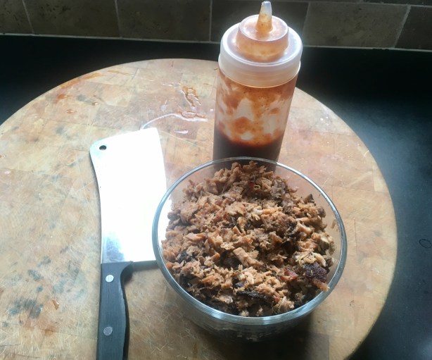 I prefer to chop (versus shred) the pork meat, including bits of fat and crunchy exterior with the meat.