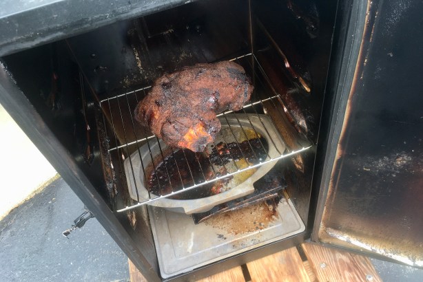 I set my smoker to 250 degrees (I have an electric smoker) and use hickory chips to smoke the shoulder. Letting the temperature drop to about 225 overnight, I smoke the shoulder for a total of about 14 hours, until the bones pulls out of the meat cleanly.